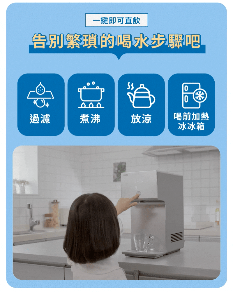 還在嫌煮水麻煩嗎?純淨水極光一鍵就能取用甘甜好水,無須過濾、煮沸、放涼、冰冰箱或反覆加熱的複雜再置程序,可取代瓶裝水、淨水器、濾水壺、飲水機、熱水壺、快煮壺、冰水機、溫奶器等九種常見飲水器具,省去繁瑣步驟,一機滿足全家人對水的所有渴望與需求。