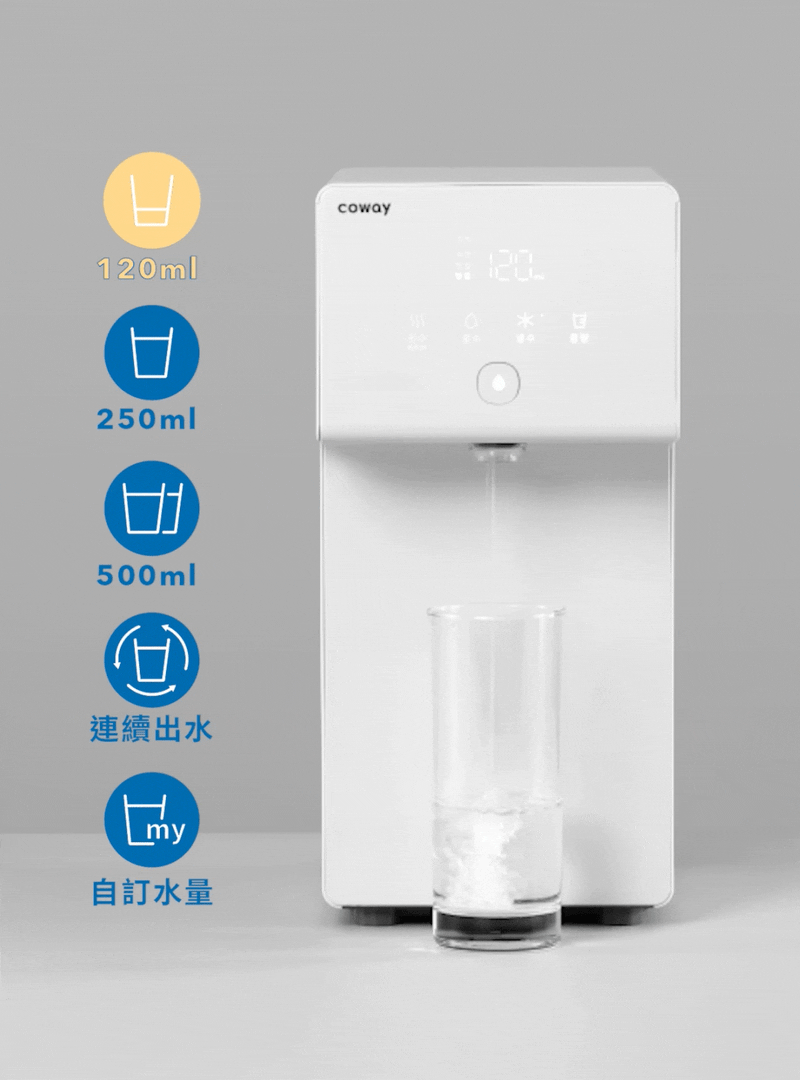 內建 5 種出水量設定,可自由選取 120ml、250ml、500ml 水量、也能自訂或連續大量出水,最高可達每分鐘 1400ml 出水量,裝水無需按壓等待,一鍵開啟優雅的飲水生活。
