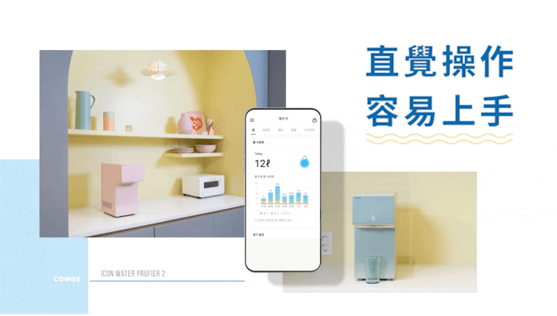 獨家 IOT 與 APP 串連,可透過 APP 設定個人專屬水量、睡眠模式等客製化功能,並附有個人專屬飲用水量紀錄,若 48 小時機器未使用,也會發通知給設定的使用者;內建耗材使用時間、訂購預約耗材服務、快速查詢故障排除和銀髮族照護功能,專屬智能 APP 讓每個人都能輕鬆享受更完美的飲水日常。