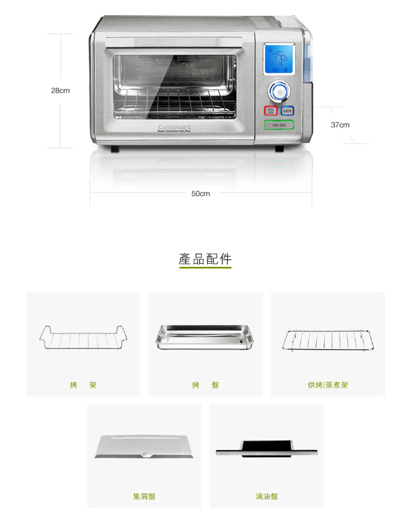 內容物:可拆卸式水箱/烤盤/烤架/集屑盤/集油盤/烘烤、蒸煮架/ 食譜/保固書