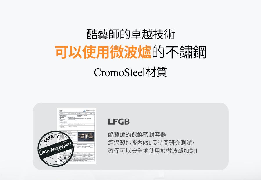 輕巧耐用的 304 不鏽鋼材質,採用 CromoSteel,由 WSD 選定連續 10 年第的不鏽鋼領先品牌 POSCO 公司開發生產;通過德國 LFGB 檢驗,以及美國 FDA 有害物質檢驗,使它成為世界第一個可以使用微波爐加熱的不鏽鋼抗菌保鮮盒。