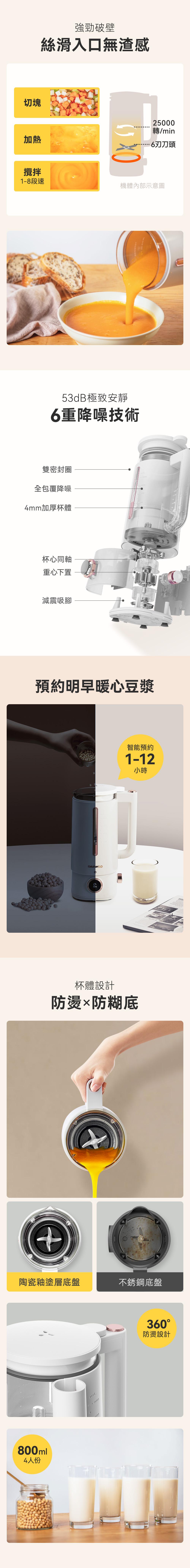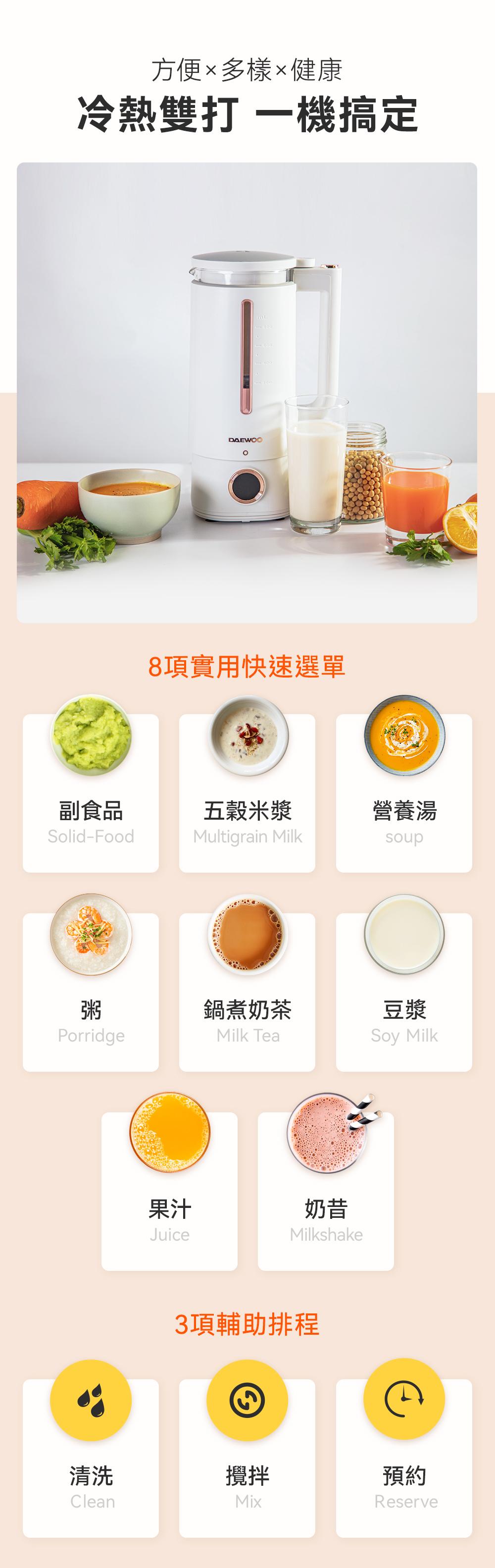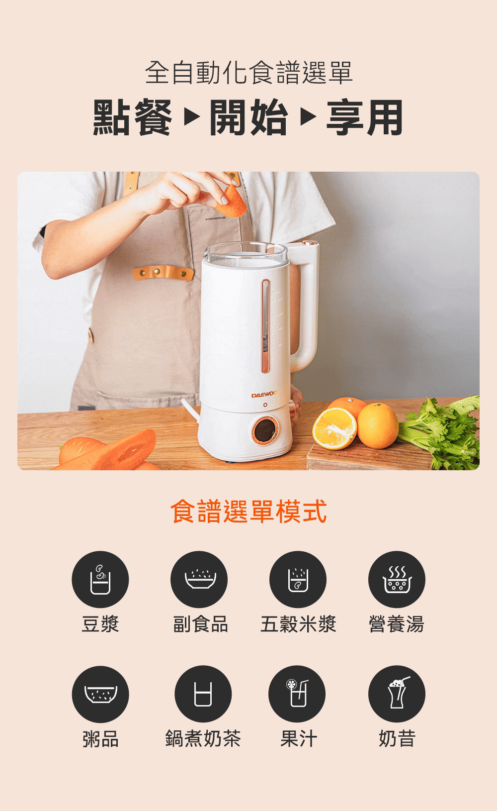 一機 8 役,擁有豆漿、副食品、五穀米漿、營養湯、粥品、鍋煮奶茶、果汁、奶昔模式,還有攪拌、清洗、預約 3 種輔助模式,微電腦智能選單,簡單直覺旋鈕設計,一鍵滿足各種需求,800ml 剛剛好容量,一次可做約 4 人份的料理。