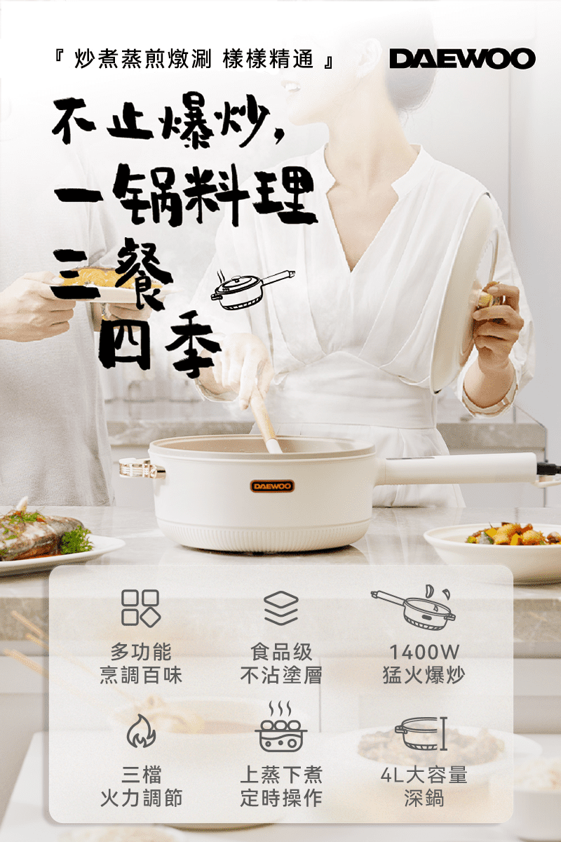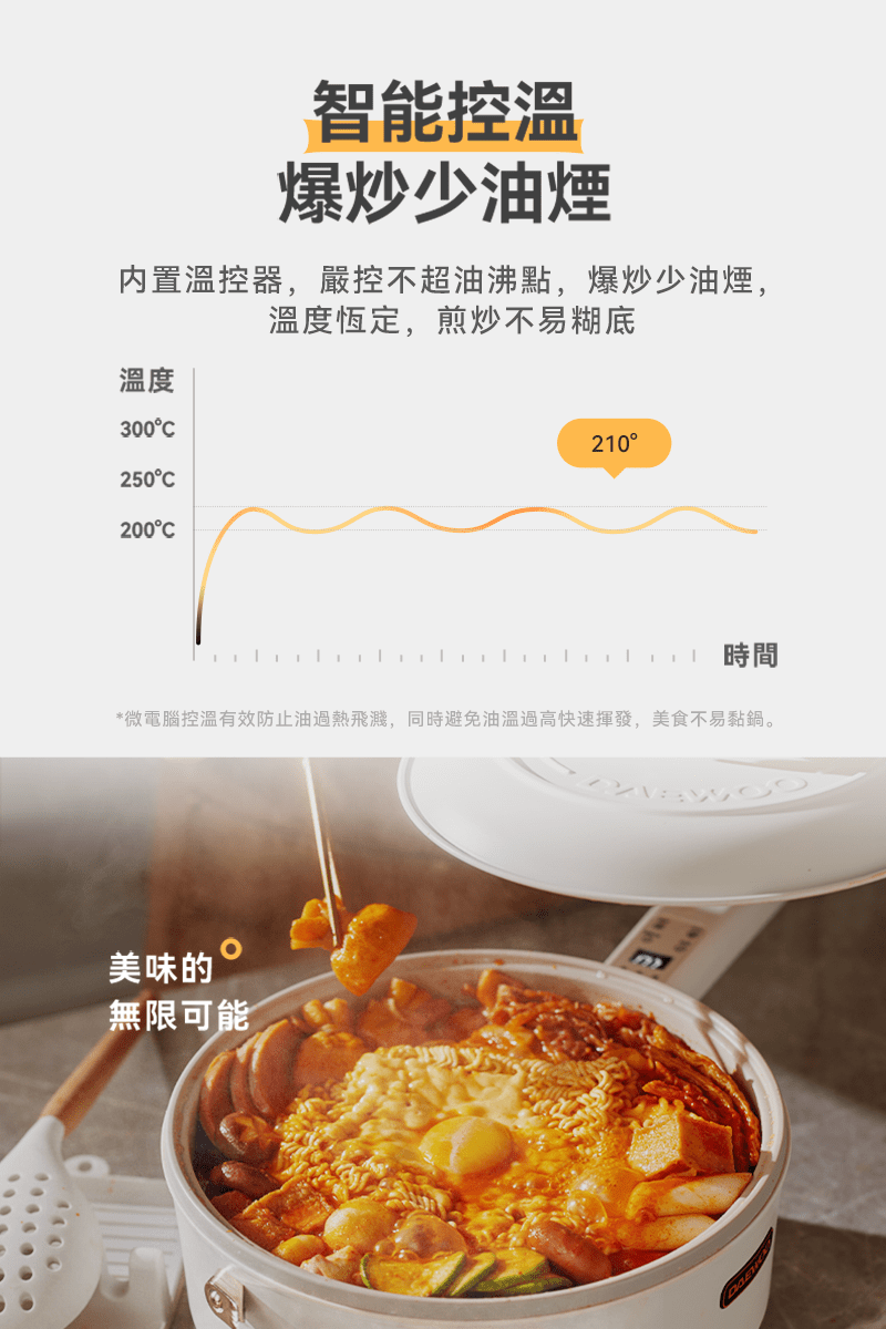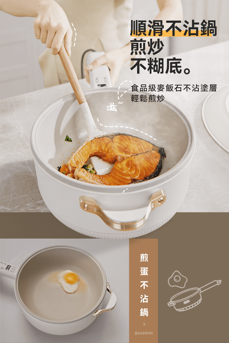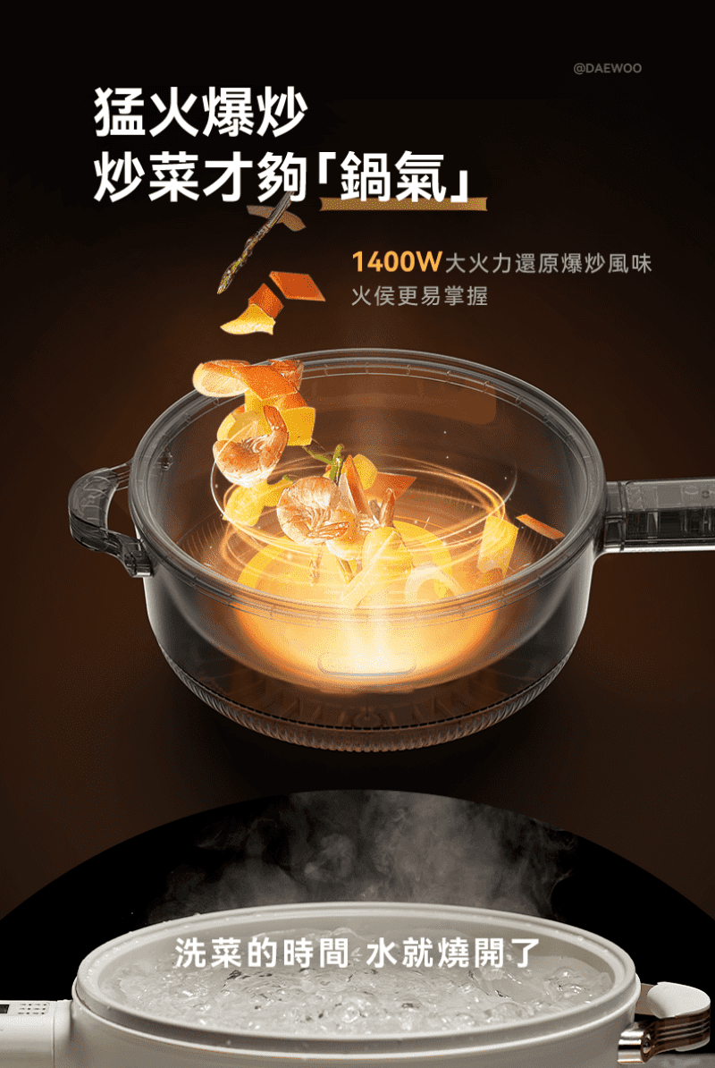 韓國多功能烹調鍋能解決煎、煮、涮、炒、炸、煮等六種料理需求,智能精準控溫,1400W 大功率,使用大火爆炒食材也沒問題!貼心上蒸下煮設計,省時又便利,食品級麥飯石不沾塗層,清潔方便家人能放心使用。
