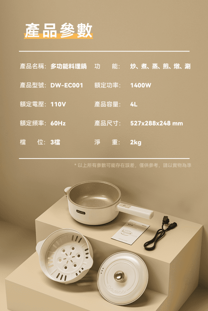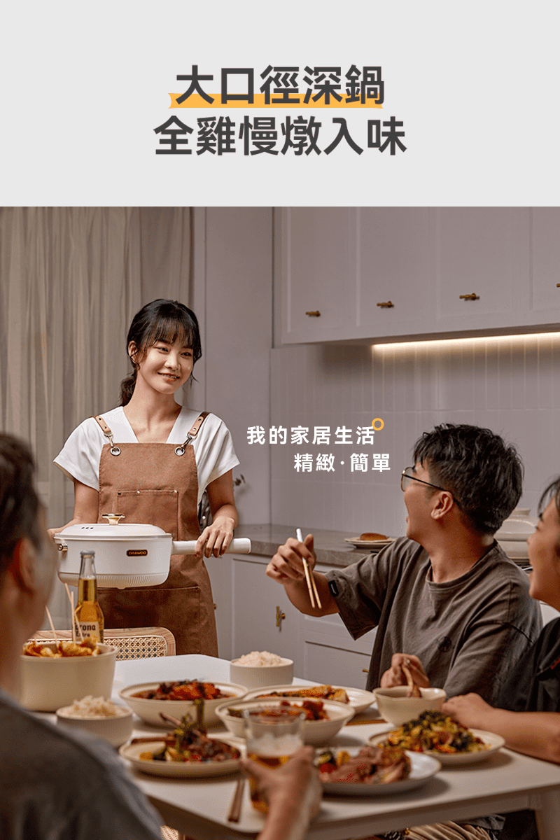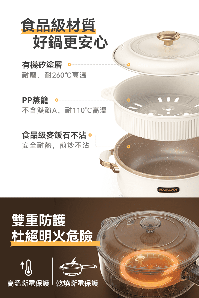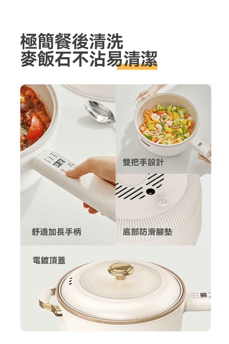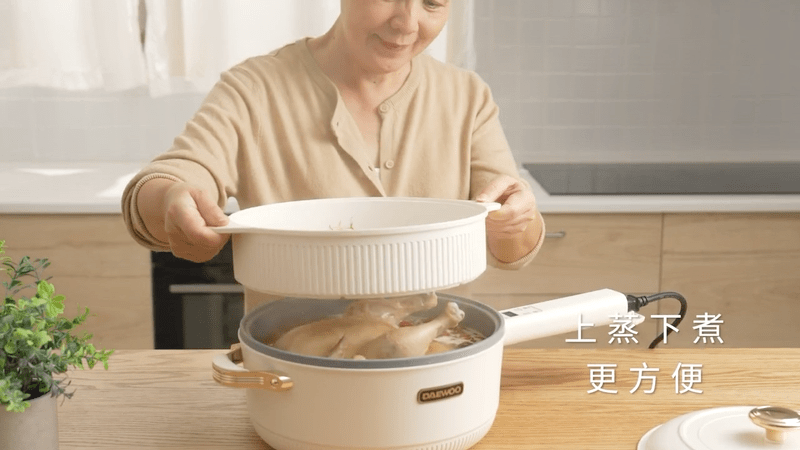 韓國多功能烹調鍋能解決煎、煮、涮、炒、炸、煮等六種料理需求,智能精準控溫,1400W 大功率,使用大火爆炒食材也沒問題!貼心上蒸下煮設計,省時又便利,食品級麥飯石不沾塗層,清潔方便家人能放心使用。