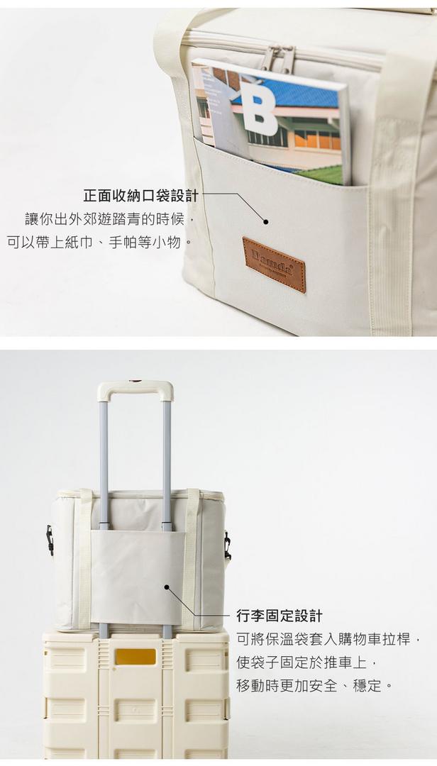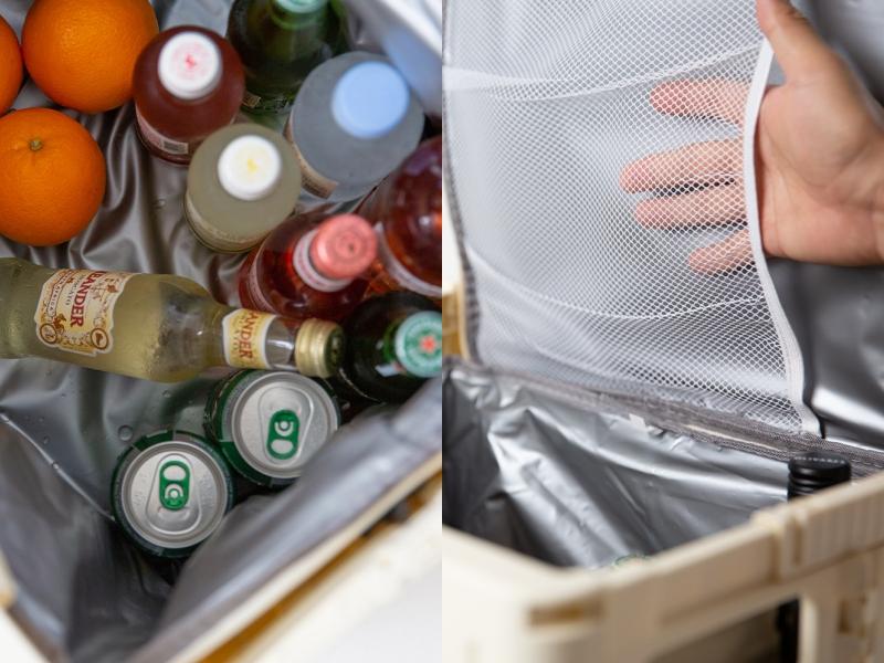 保溫袋內裡以能冷熱保溫的材質製成,內部有網袋設計,可根據自身需求收納;超大收納容量可以放進各種水果、牛奶、冷凍食品及飲料。