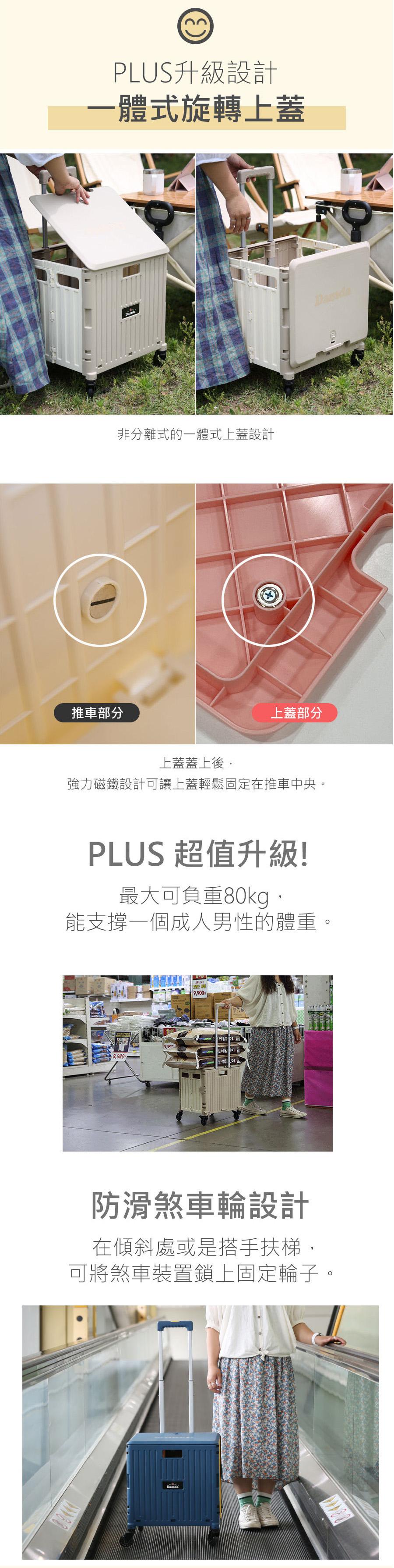 新款購物車全面升級,一體式旋轉上蓋,方便使用時摺疊收納,最大耐重度達 80kg,能承裝各種露營用品、餅乾、飲料等,也能給孩子安心使用,由韓國設計師專門打造,七款時尚簡約配色任你挑選。