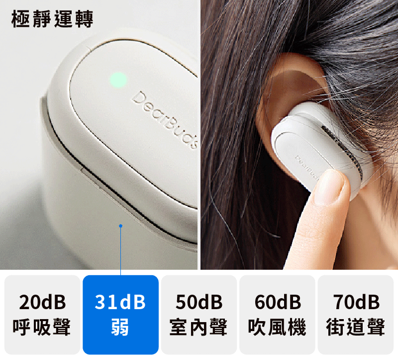 採用超小型的磁浮風扇,並在耳塞上搭載了噪音濾波器,完成了低噪音效果。即使在強力模式下,噪音僅為 33dB,就像耳語一般安靜!