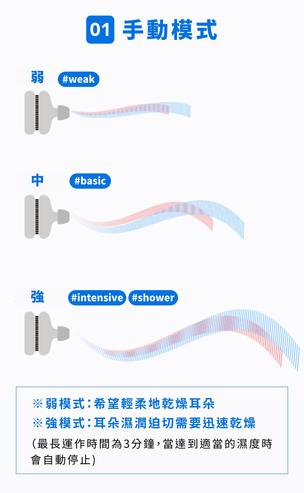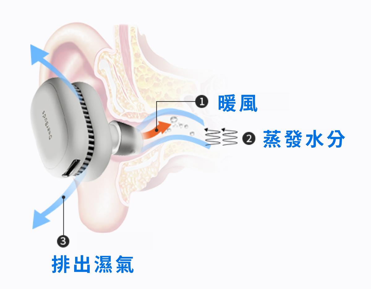 採用空氣循環模式,能大幅度提升乾燥速度,完全不會刺激耳道,減少日常生活中耳朵內部無法通風,容易導致的各種問題。