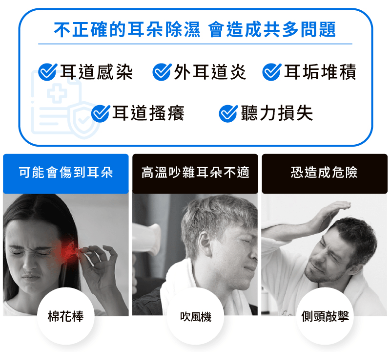 它不是直接吹風,而是創造空氣流通以最大程度地減少刺激,安全降低耳內濕度,並不會對耳朵造成損害或不適。