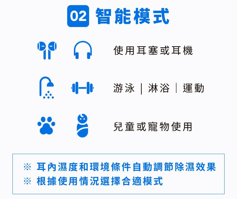 根據耳內的溫度、濕度資訊以及用戶不同的使用場景,採用智能演算法迅速識別耳部的濕度狀況,能快速乾燥耳部,同時兼顧周圍環境的因素,讓耳道停留在最佳狀態。