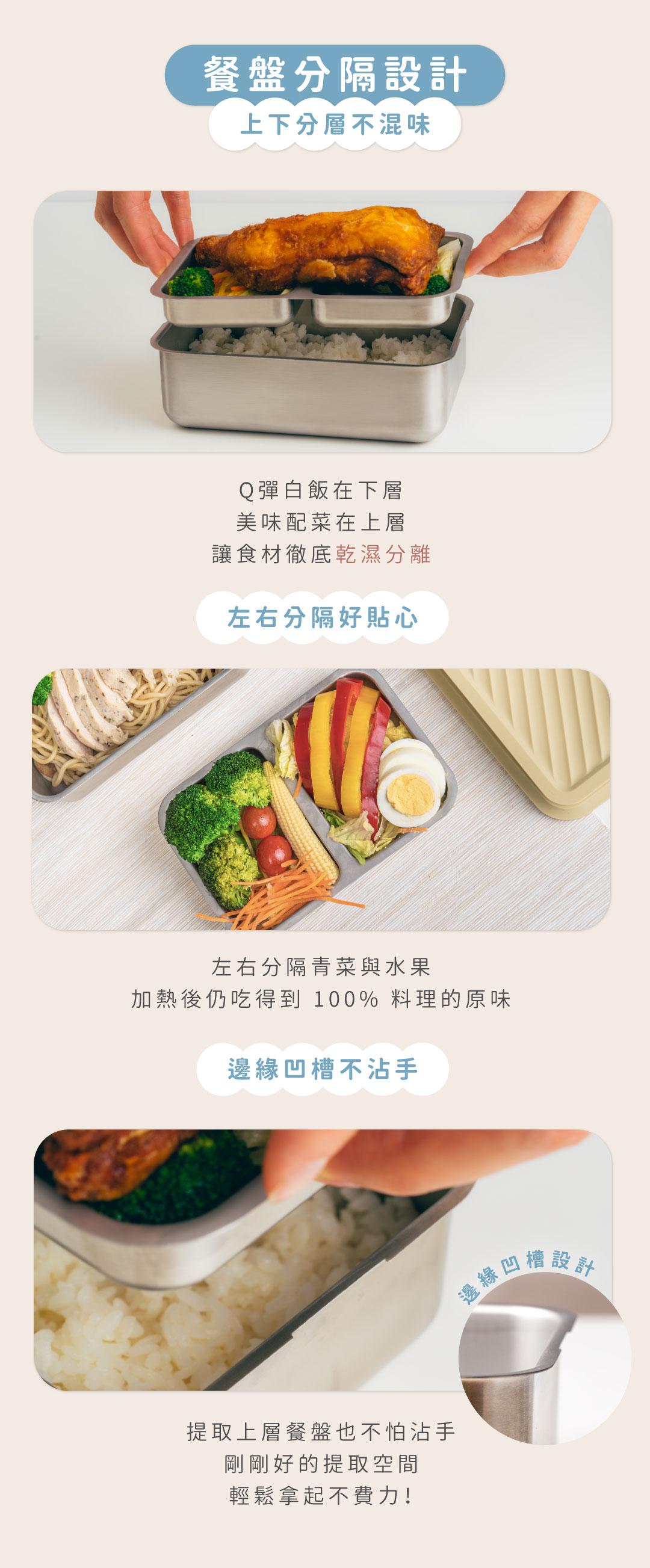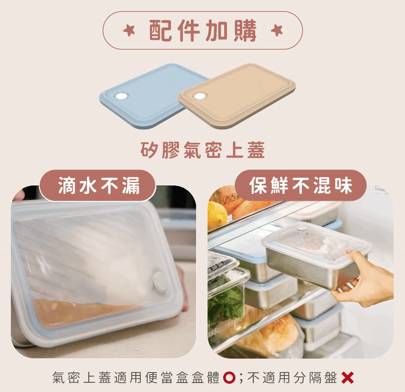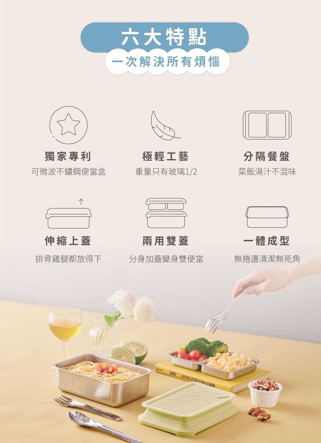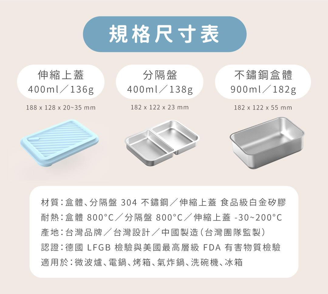 內容物:可微波不鏽鋼盒體、可微波不鏽鋼分隔盤、白金矽膠伸縮上蓋