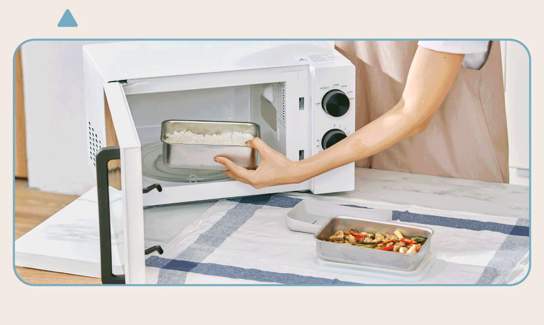 不鏽鋼盒體與分隔盤需分開微波使用。