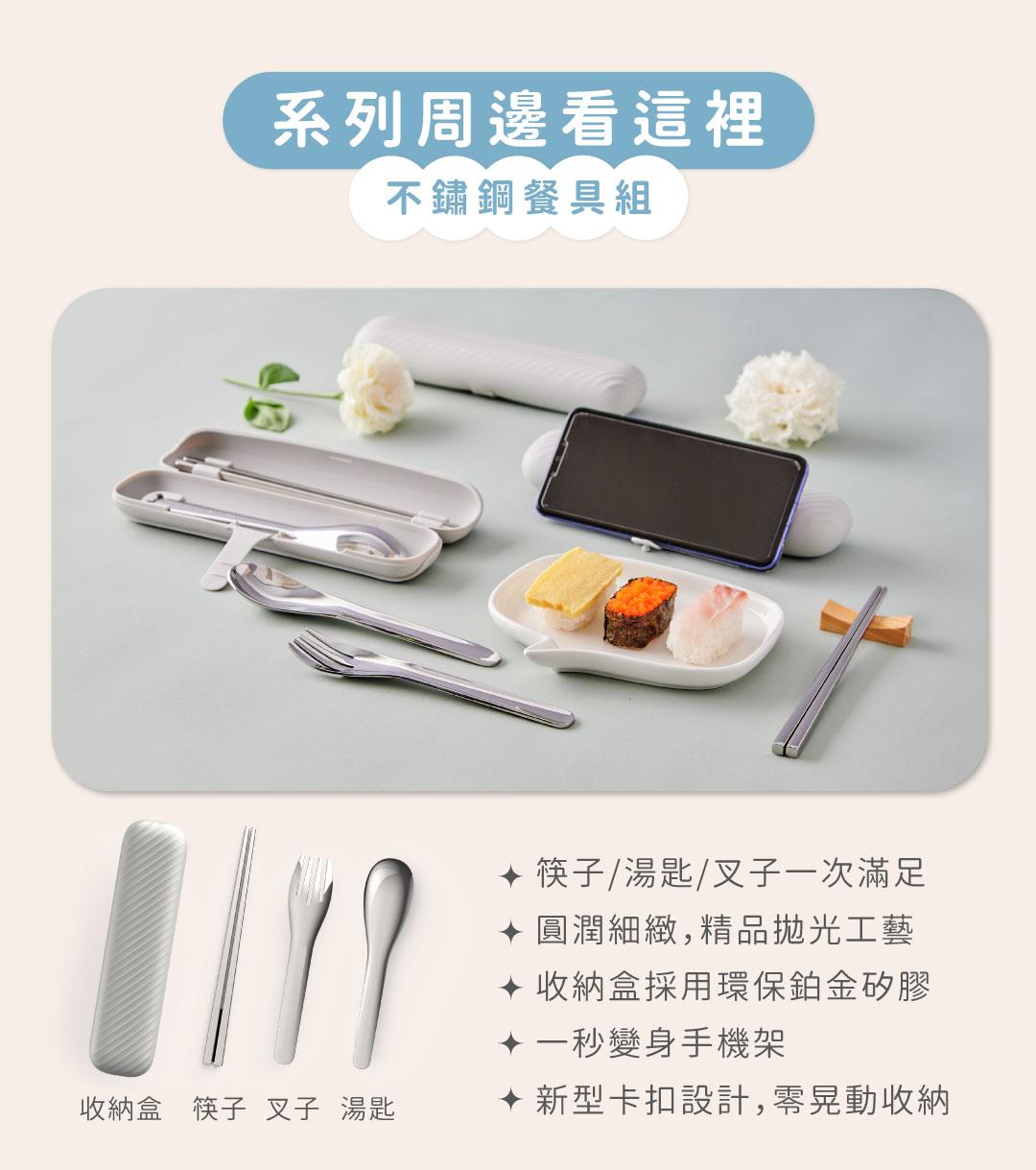 內容物:白金矽膠收納盒、不鏽鋼筷子、不鏽鋼湯匙、不鏽鋼叉子