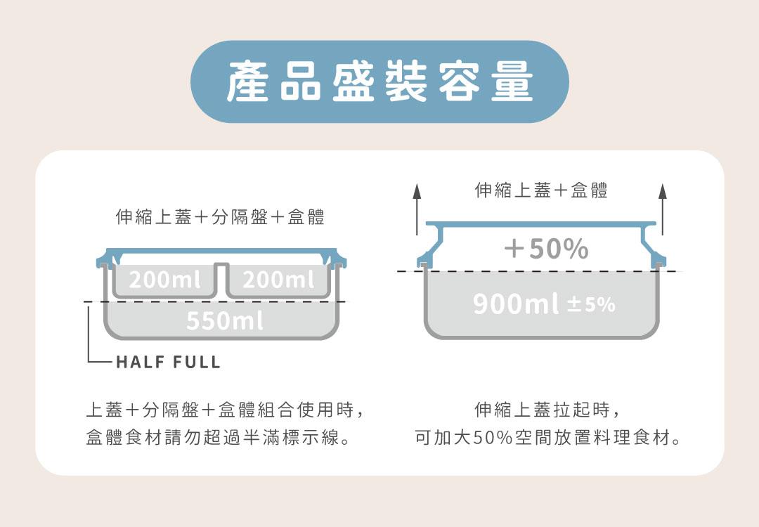 組合容量:盒體 550(半滿)ml ± 5% + 分隔盤 400ml ± 5% + 伸縮上蓋 400ml ± 5%