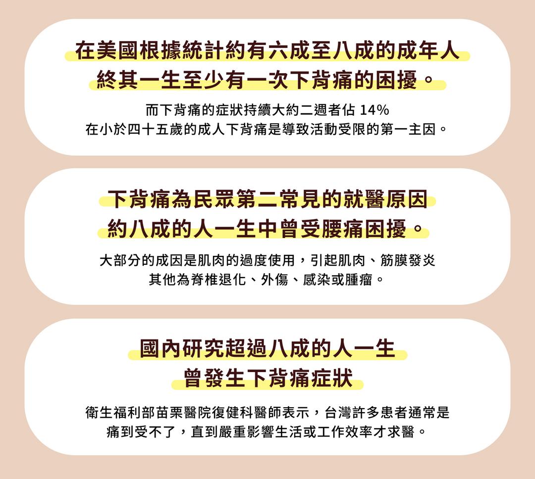 身處於手機不離身的世代,「低頭」已是所有人共同的生活模式,且隨著老化人口增加,背部疼痛的盛行率持續升高。