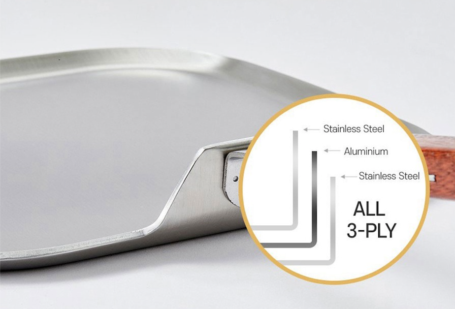 在不鏽鋼之間加入鋁,整體鍋身皆以三層不鏽鋼製成,極速導熱效果,料理起來省時又節能。