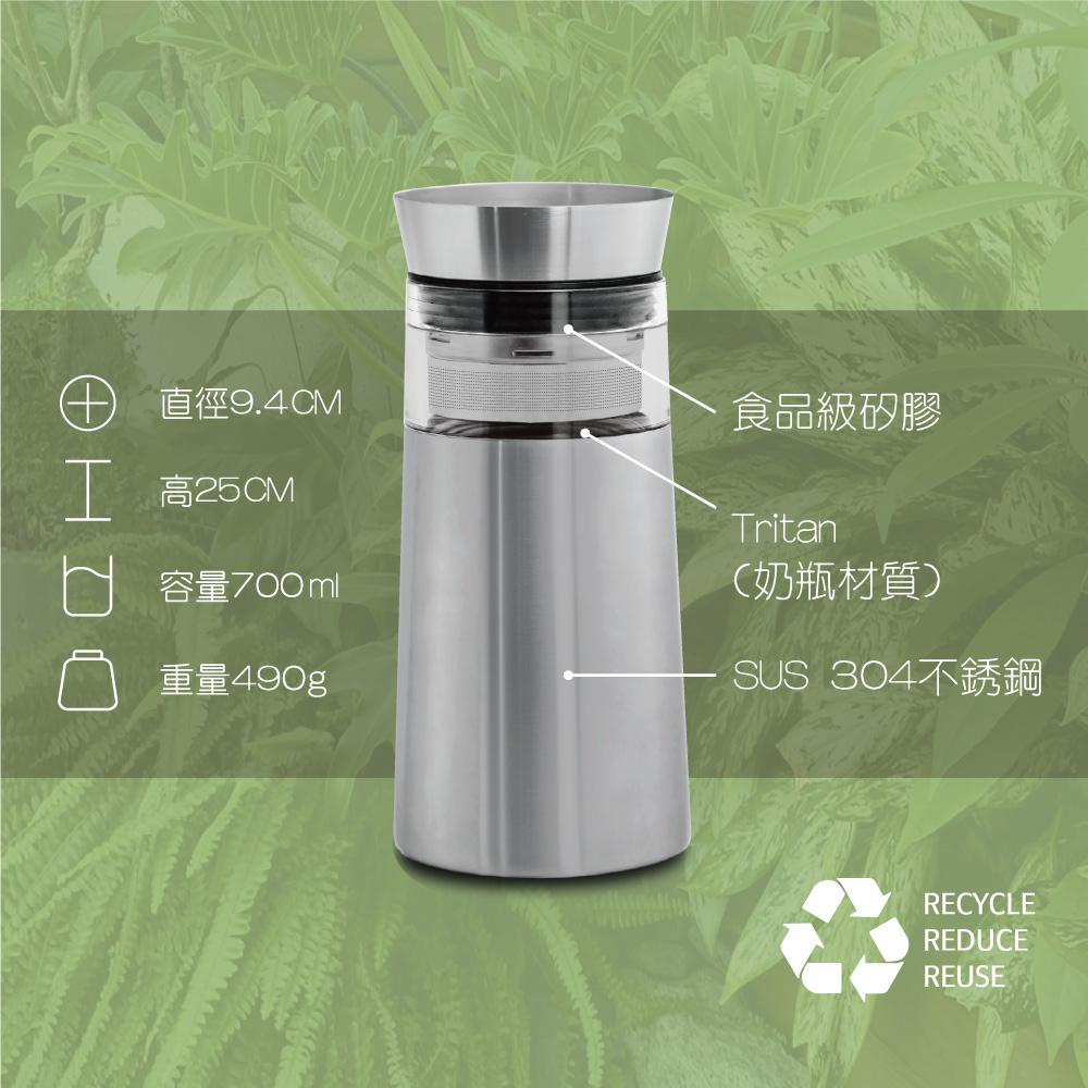 700ml 大容量的空間設計,能夠完整萃取每一片茶葉,完整釋放甘醇茶韻,同時減少茶葉使用量;上層瓶身透明可視,能直接掌握茶飲水位與茶葉浸泡狀況,讓每一泡茶湯都能呈現「最佳狀況」。