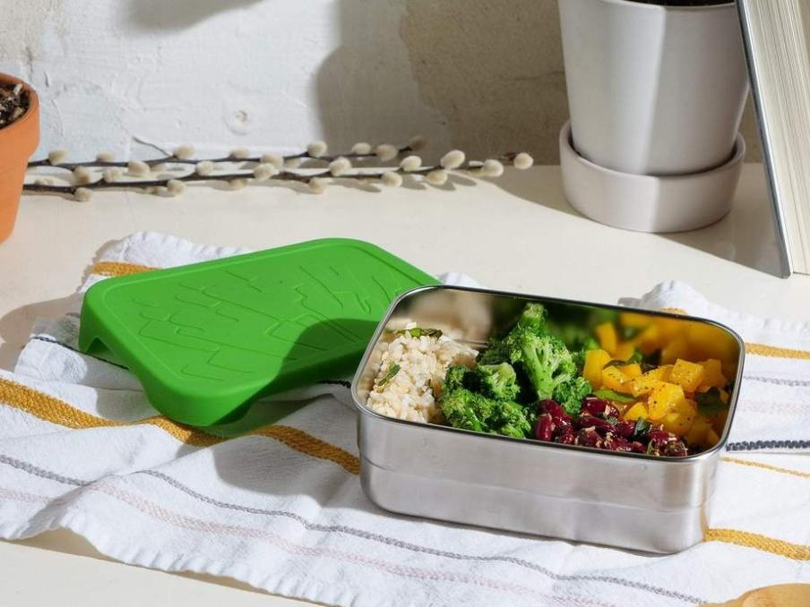 不鏽鋼便當盒搭配專利防滲漏矽膠蓋,特殊設計可讓孩童輕易開啟不燙手,還能夠完整收納灑脫便當點心組,一起搭配使用。