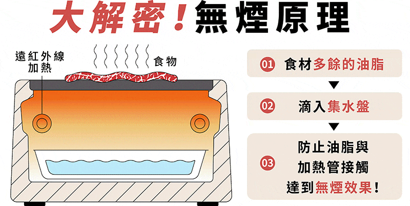 採用側邊遠紅外線加熱,在集油盤內加入適量清水,烤肉中食材多餘的油脂會滴入盤中,有效防止油脂與加熱管接觸,達到降低煙霧的效果。