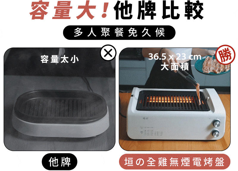 36.5 x 23cm 大面積不沾烤盤,一次可烤 6-8 片肉片,多於他牌烤盤肉量,多人聚餐想吃烤肉免久候。