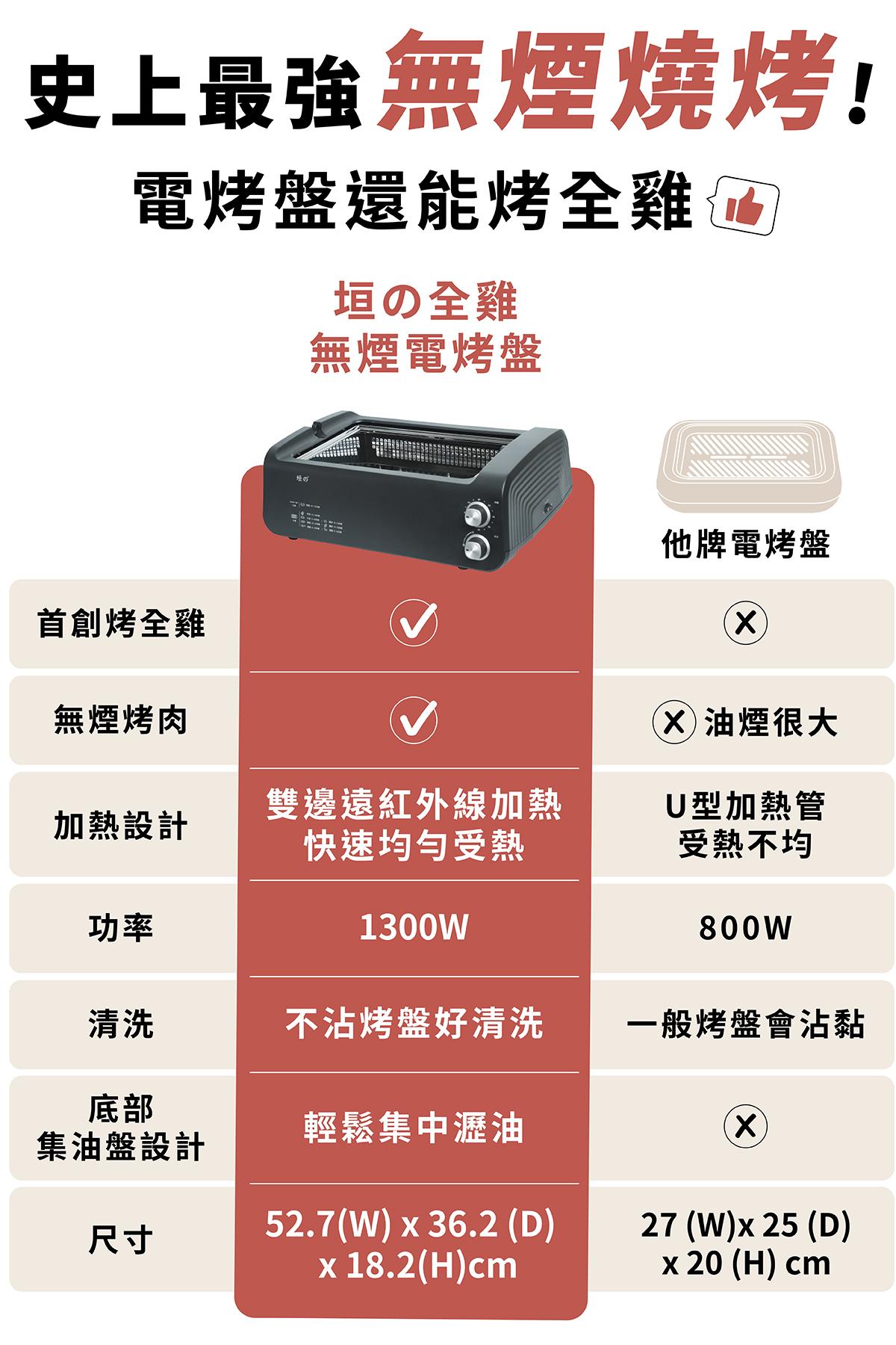 - 1300W 超大火力,隨附專用烤盤架