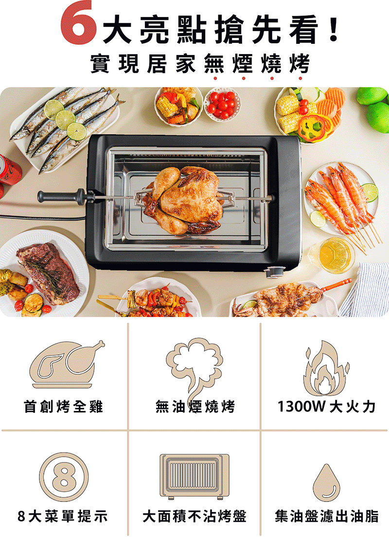 全台首創烤全雞,360 度完美烘烤!無煙設計不怕滿屋子充滿油煙,1300W 大火力搭載遠紅外線加熱,均勻烘烤各種料理,底部集油盤設計,高效減油少負擔,居家就能優雅享受烤雞燒烤饗宴!