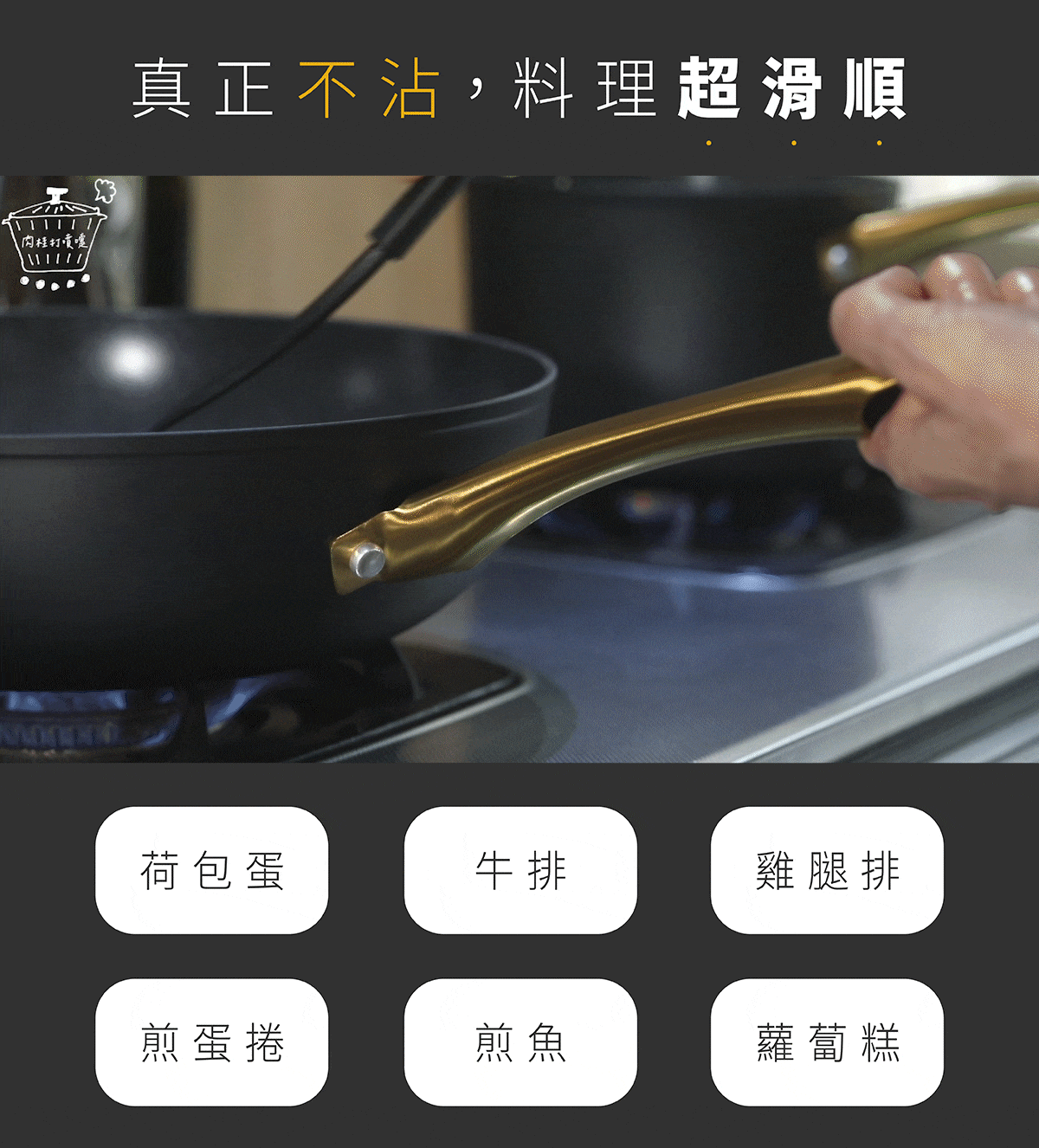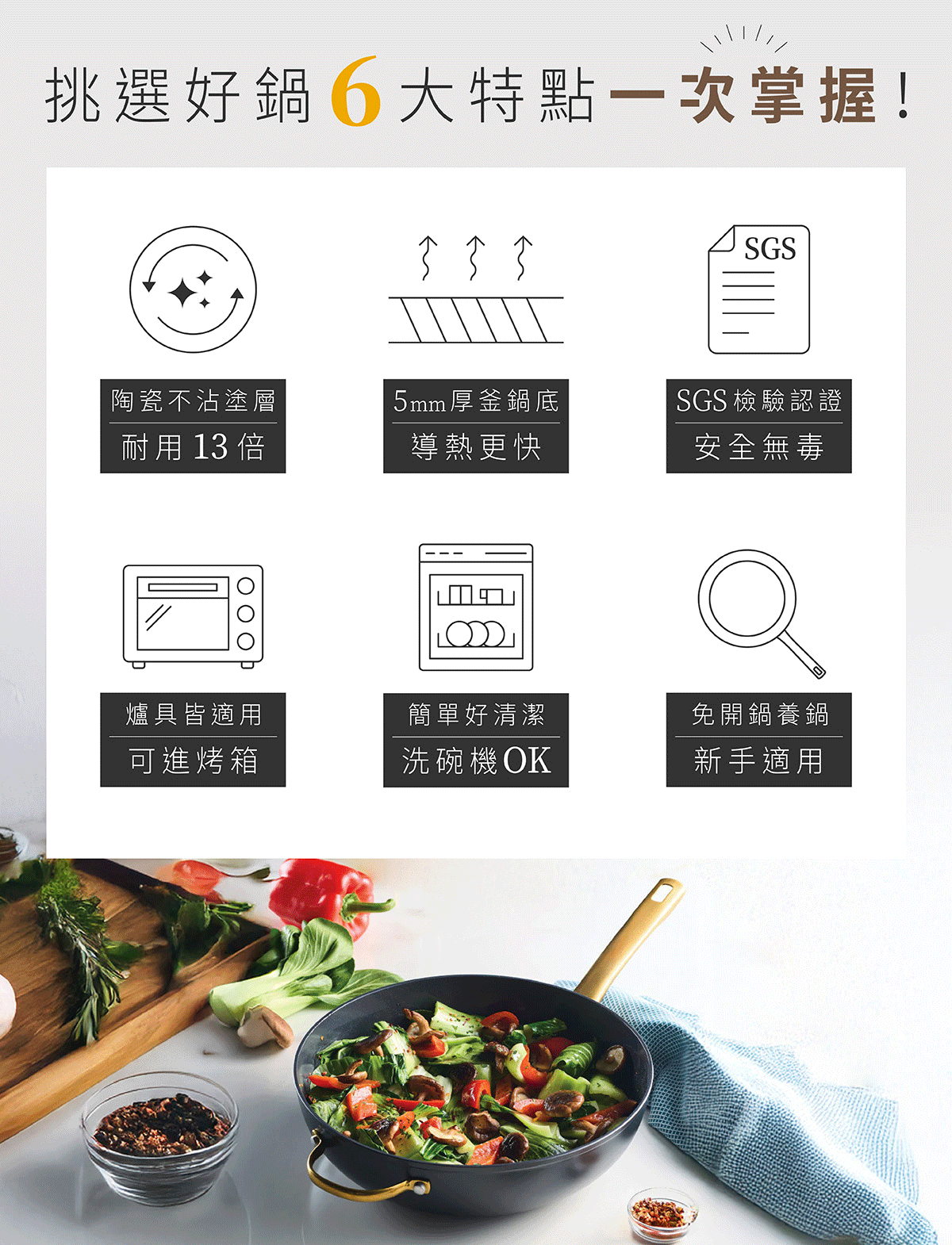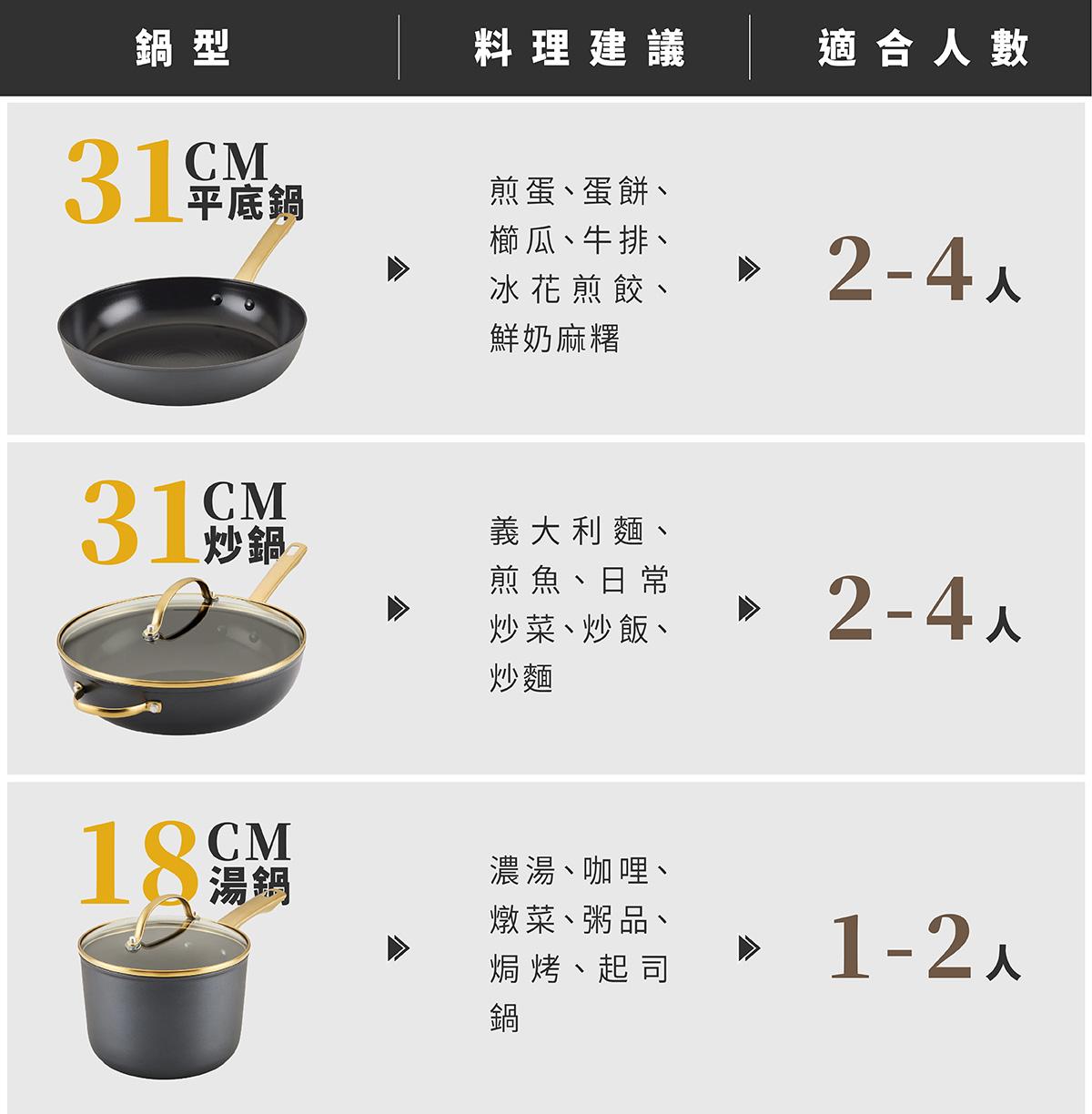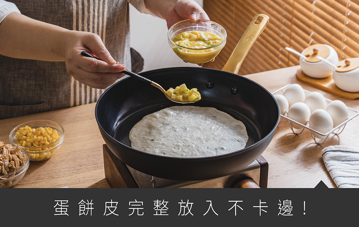 多層陶瓷不沾塗層設計,除了帶來優異不沾效果,長時間使用依然穩定表現,兼顧安心無毒與高耐用性,全爐具通用設計讓料理更輕鬆,低調黑金外觀讓廚房質感瞬間升級。