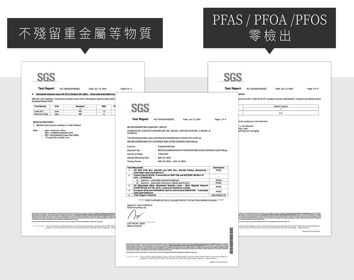 通過國際第三方 SGS 檢驗,不含 PFAS、PFOA、PFOS 及重金屬(鉛、鎘),相較傳統不沾塗層,使用更安心。
