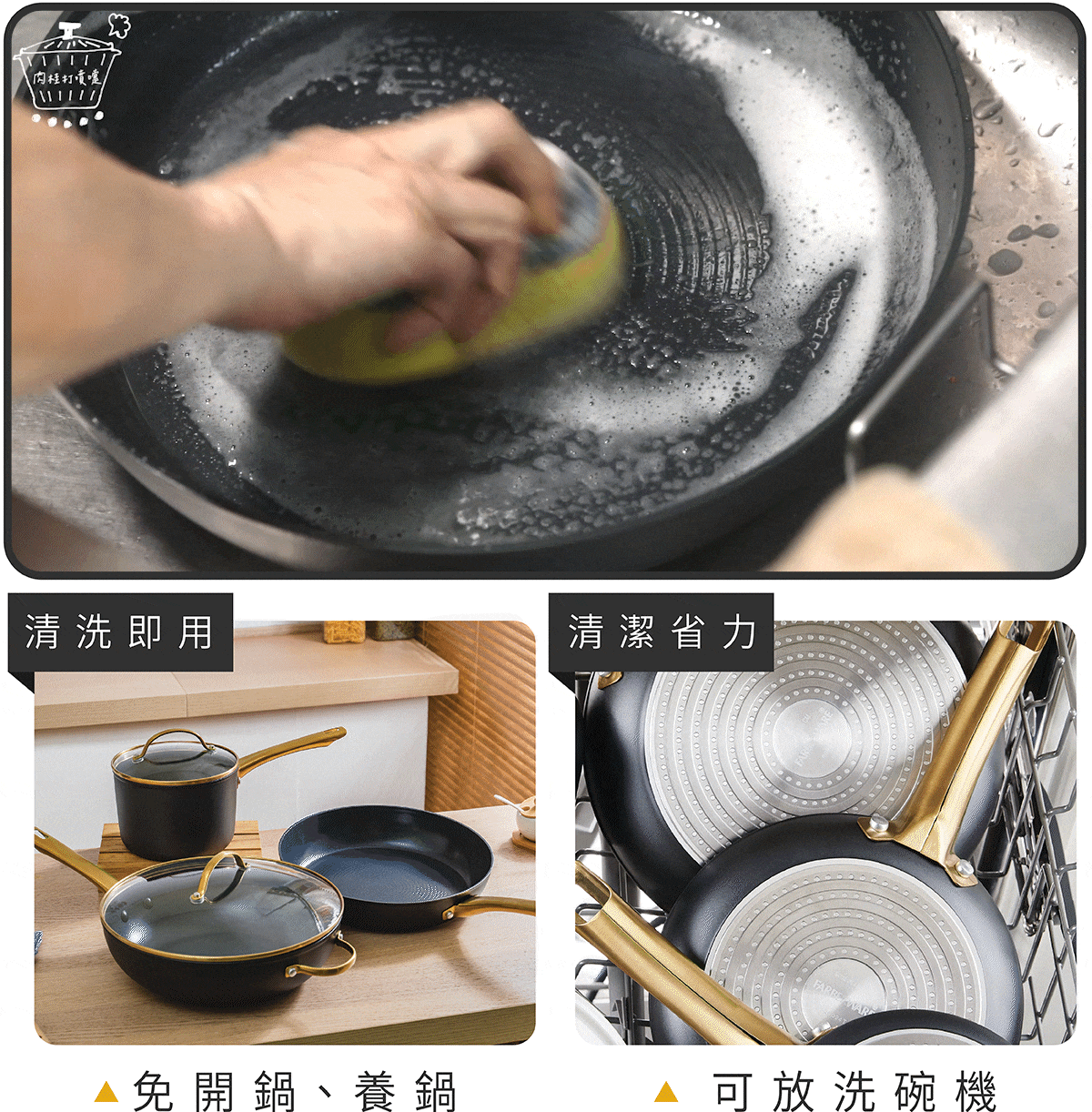 鍋面不易殘留油污,可放入洗碗機清洗,亦可使用烘碗機烘乾,清潔省時省力。無需繁瑣保養,免開鍋、免養鍋,清洗後即可直接使用。