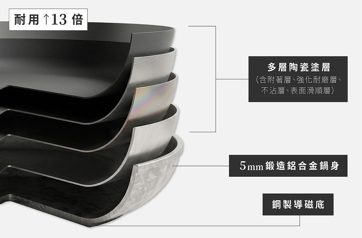 採用多層結構設計,由附著層、耐磨強化層、不沾層與滑順表層層層堆疊,全面提升不沾效果與耐用性。