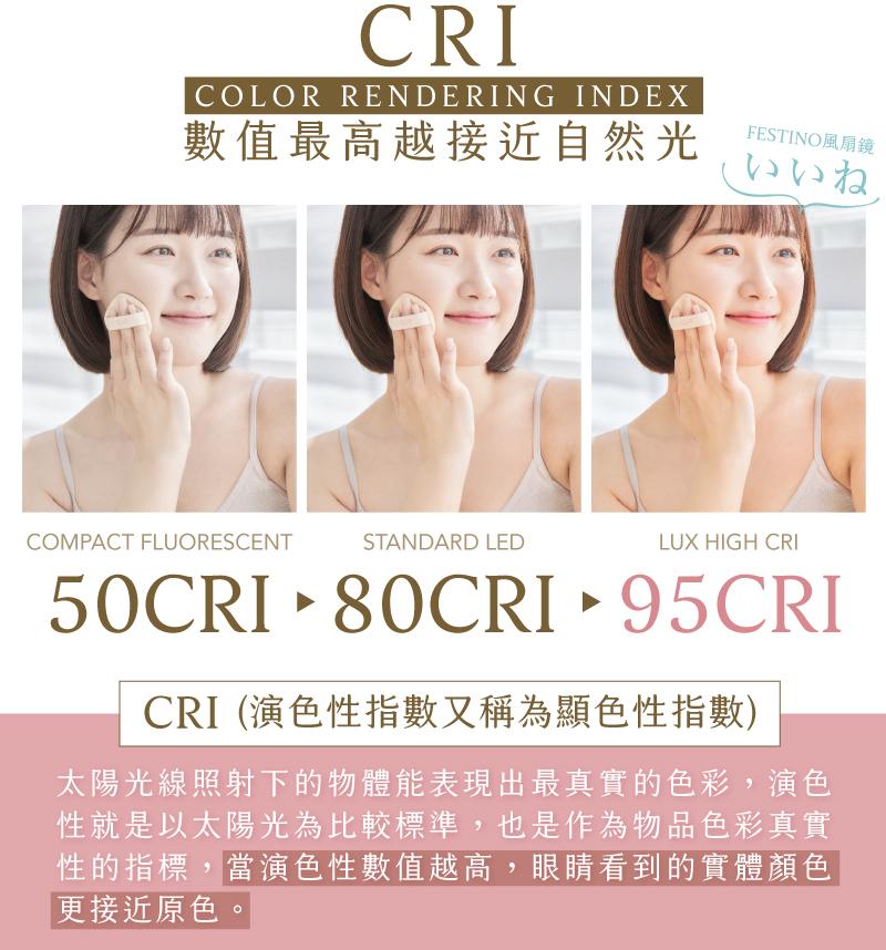 可兩段調整 CRI 達 95 的自然柔光燈色,提供高顯色指數,還原肌膚和妝容真實漂亮,提供更舒適的化妝環境。