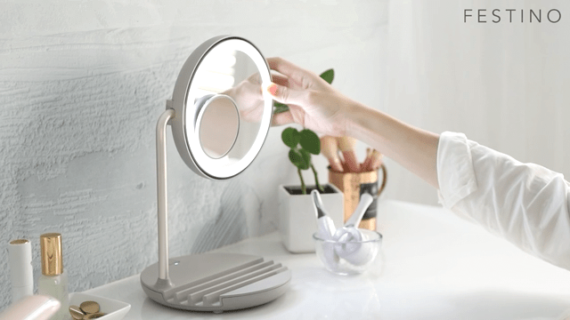 180 度旋轉功能的化妝鏡,可停在任何想要的角度,在不同桌子高度下都能順暢進行化妝。