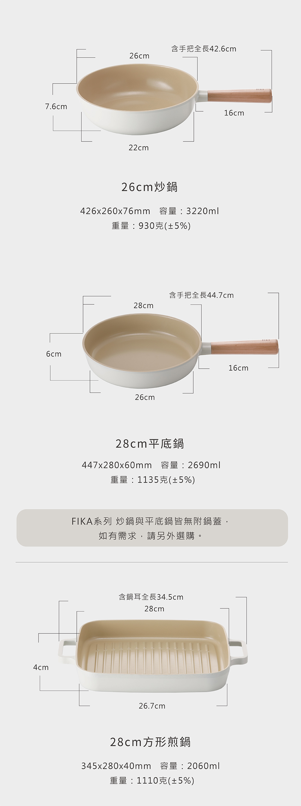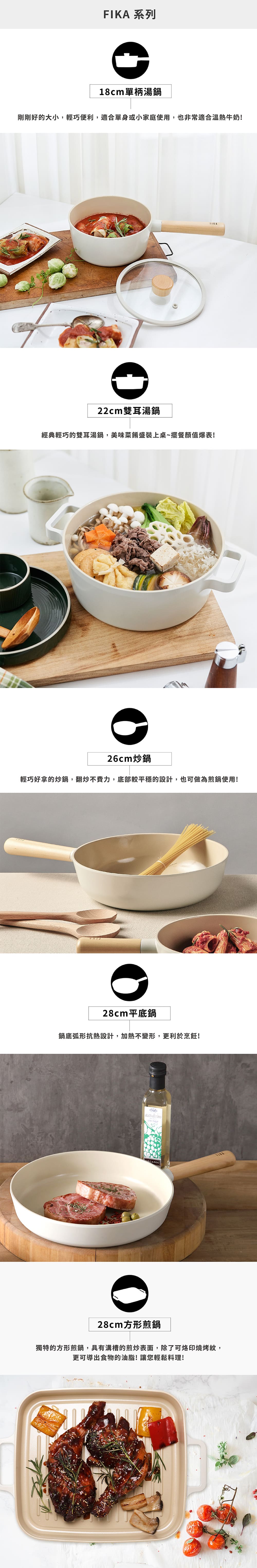系列商品:18cm 單柄湯鍋(附蓋)、22cm 雙耳湯鍋(附蓋)、炒鍋(26cm)、深平底鍋(28cm)、方形煎鍋(28cm)