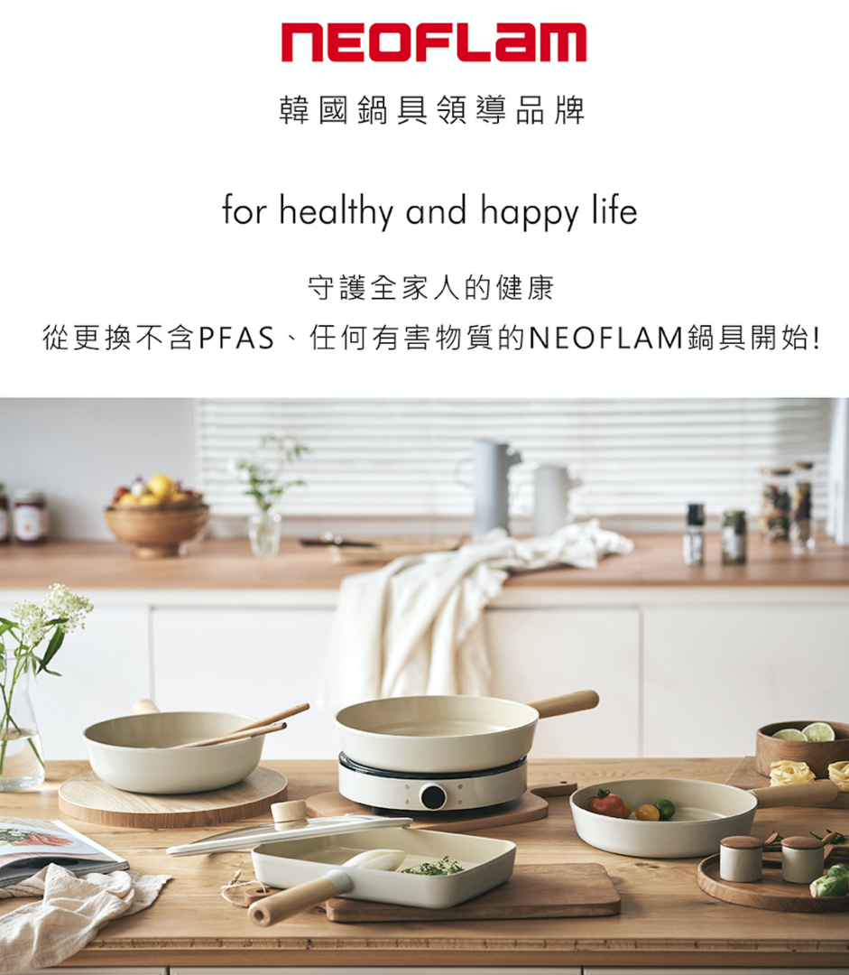 韓國 NEOFLAM 以顧客的健康與幸福作為最優先的考量,全天然陶瓷塗層的鍋具,不含鉛鎘、PFOA 或任何有毒物質,可安心使用;快速導熱,不挑爐具,瓦斯爐、電磁爐、IH 爐皆適用,多款鍋型尺寸,輕鬆滿足家庭的日常料理!