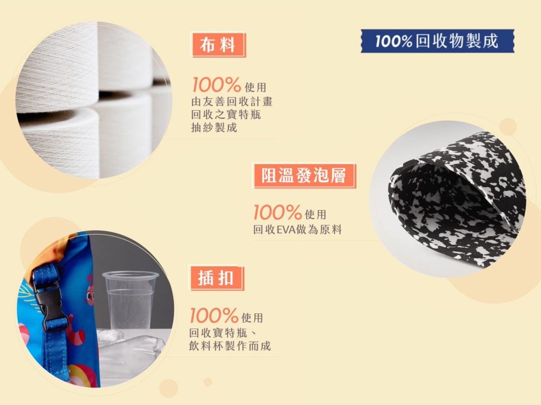 材質:100% 回收寶特瓶布料(rPET)、回收EVA、回收塑膠杯