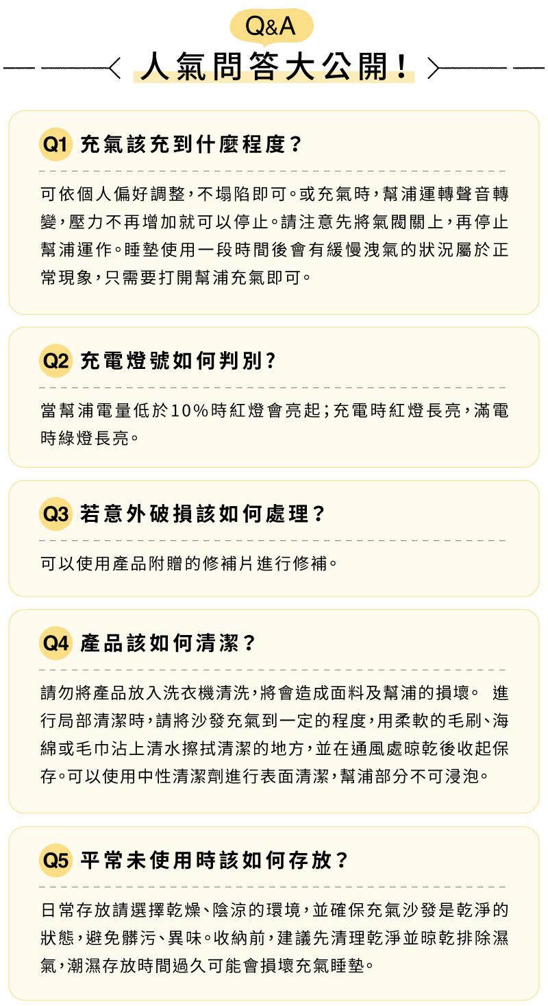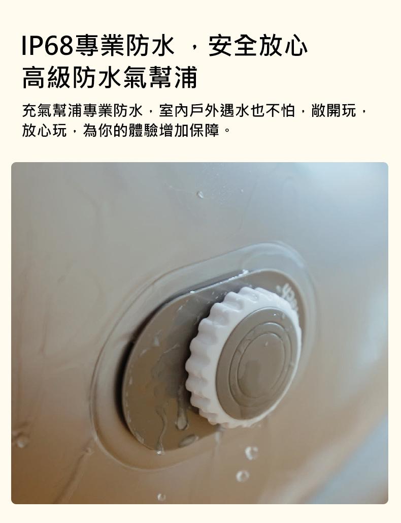 • 請勿在火花或火焰等高溫處附近充氣。 請勿將熱鍋等高溫物體放置在充氣沙發上。 收起沙發時請注意保護好充氣幫浦,防止碰撞造成損壞。 若遇降雨時,請務必蓋上充氣幫浦防水蓋。 12歲以下孩童使用時,請務必有成人在場。 平常請保持進氣口與充電孔的清潔。 充氣時請勿將手指放入充氣口內。 請避免在水中浸泡幫浦(IP68為幫浦防水蓋蓋上時檢測之數據)。 在戶外使用時,請先清理好充氣沙發底部雜物,避免尖銳物品刺穿本體。 充氣沙發充滿氣使用一段時間後會緩慢漏氣屬正常的現象,只需要打開幫浦再充氣即可。
