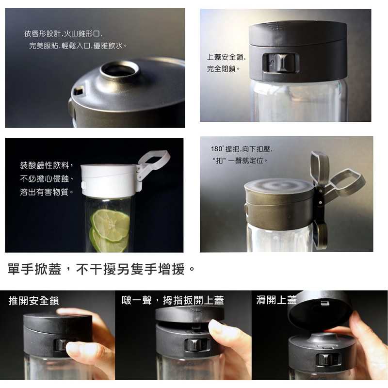 - 外層護罩 Tritan 材質,耐碰撞,質量輕,高韌性,充分保護內瓶玻璃材質
