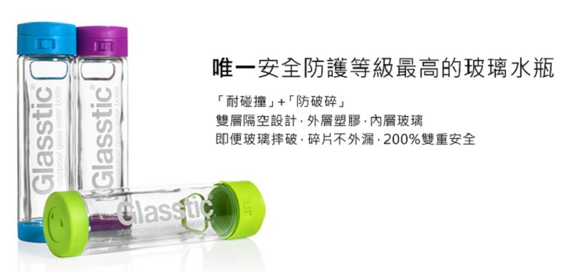 經過研究、設計、反覆測試的過程,於 2011年 誕生了 Glasstic 玻璃運動水瓶,簡潔大方的設計,方便外出,唯一安全防護最高等級的玻璃水瓶,讓人安心使用。