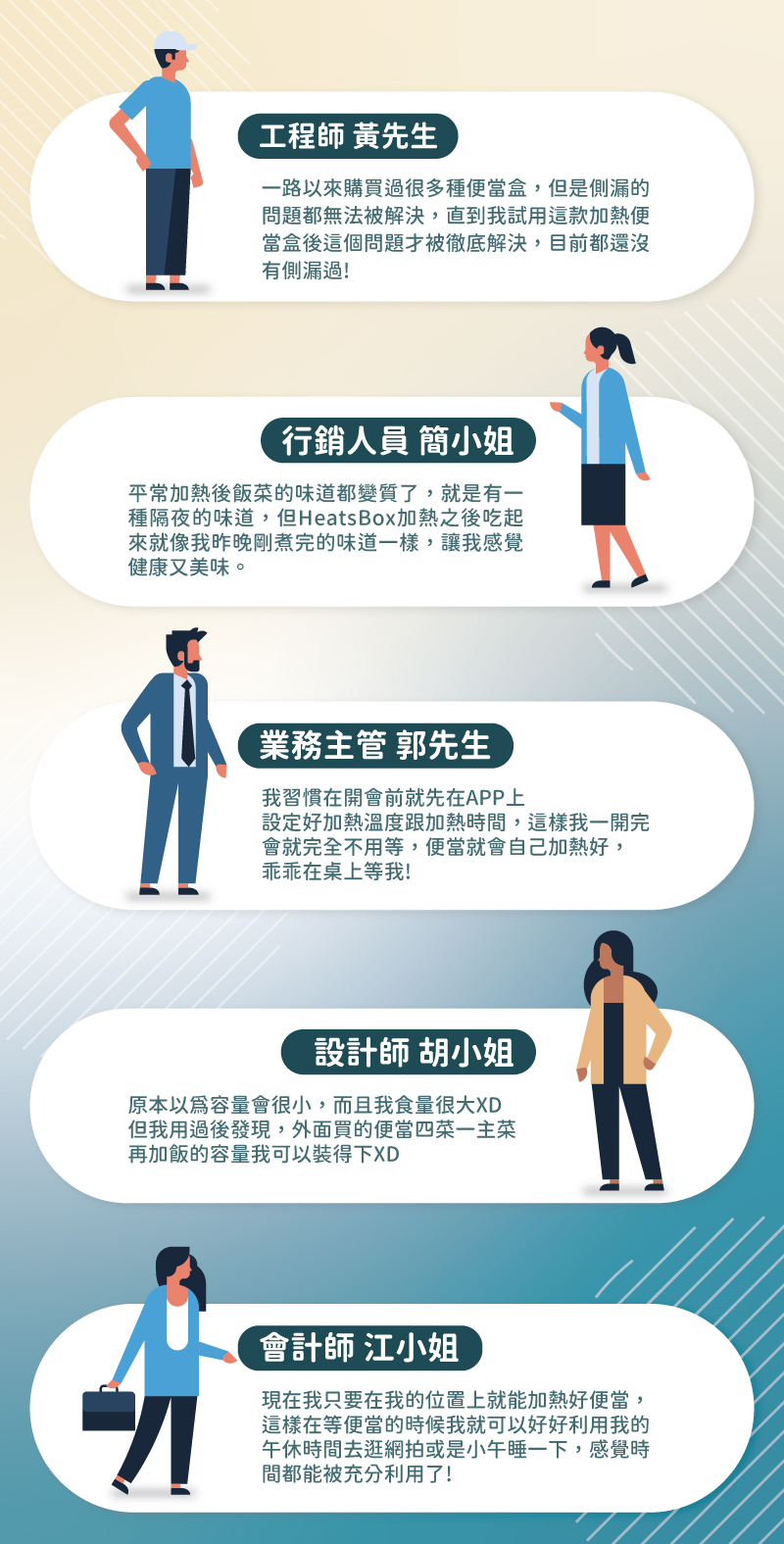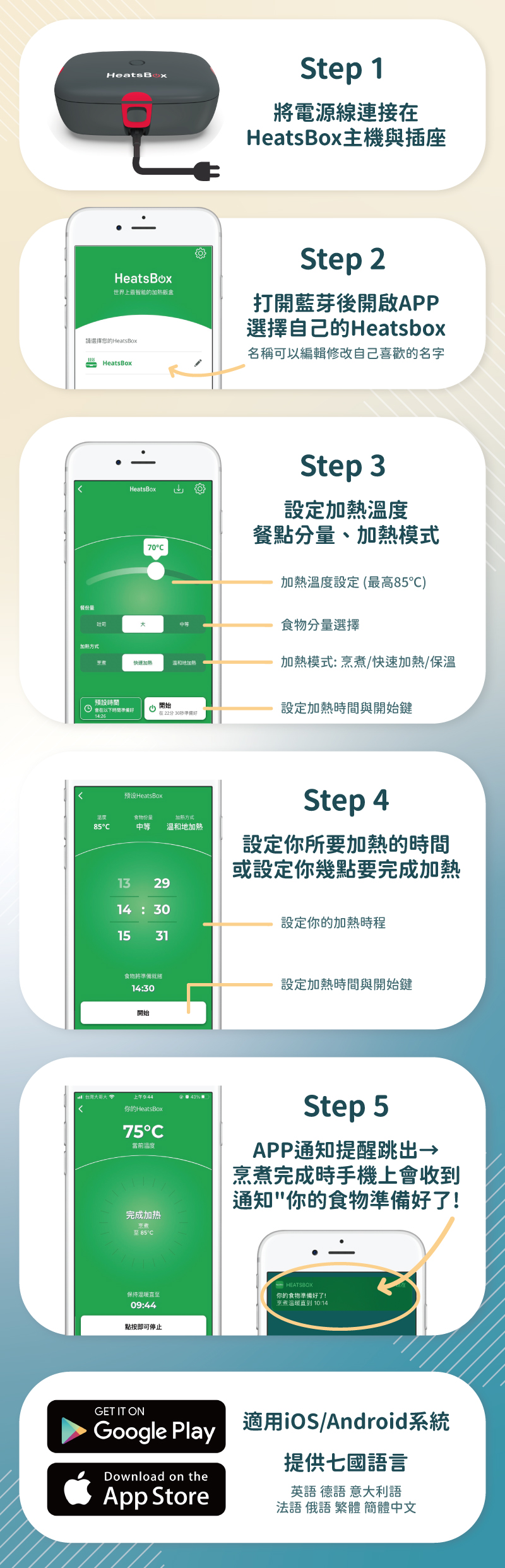 HeatsBox 智能加熱便當盒使用烘烤加熱技術,使食物不再因水氣而影響口感,同時還可以使用 APP 遠端控制便當加熱溫度及時間,解決了想自己帶便當,但又不想多人共用加熱設備的問題!