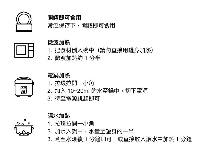 鮮盒子中的食材皆為全熟,打開就能食用,以電鍋、微波爐或一般煮鍋稍微加熱後,風味更佳!