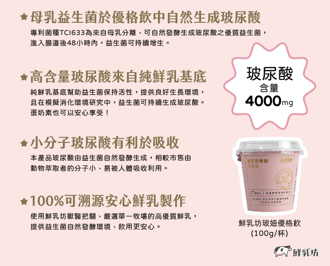 成分:鮮乳、砂糖、嗜熱鏈球菌TCI633(含玻尿酸)、酵母萃取物
