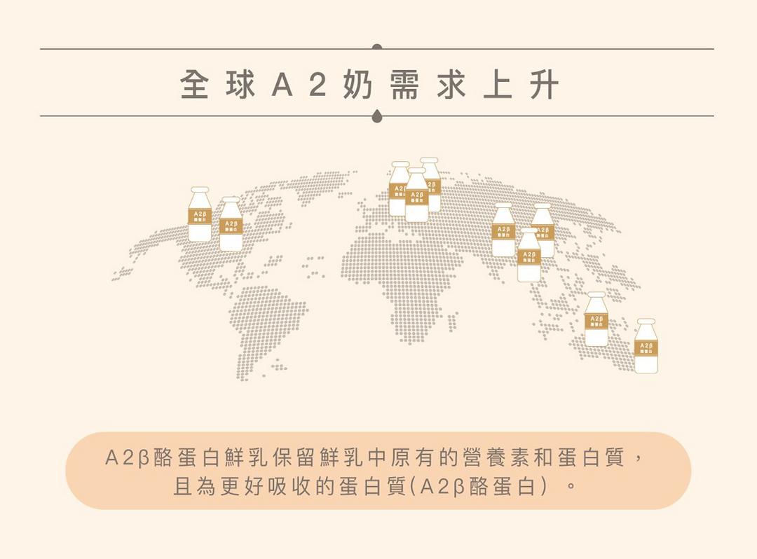 牛奶中的蛋白質,約 80% 是酪蛋白、20% 是乳清蛋白;酪蛋白中的 β 酪蛋⽩,約佔總蛋白質的 30%。A2β 酪蛋白鮮乳因為可以保留牛乳中原有的營養素且擁有更好吸收的蛋白質,而獲得近期國外市場的青睞。