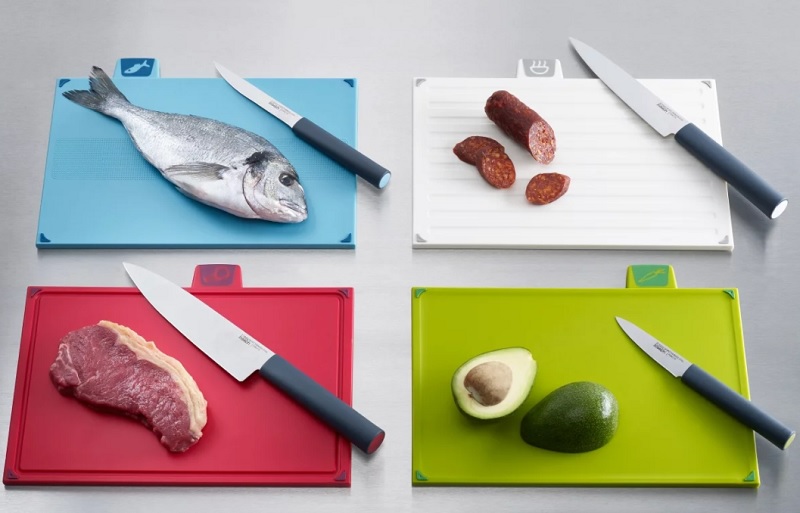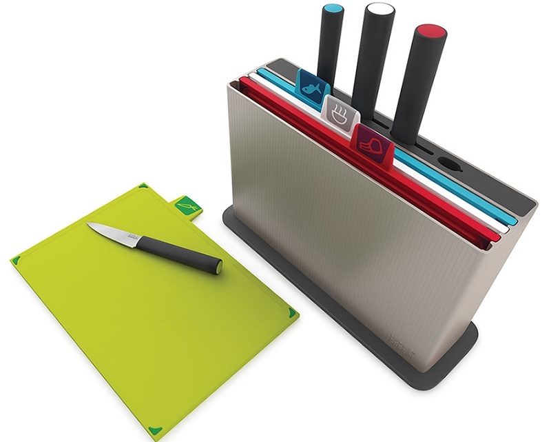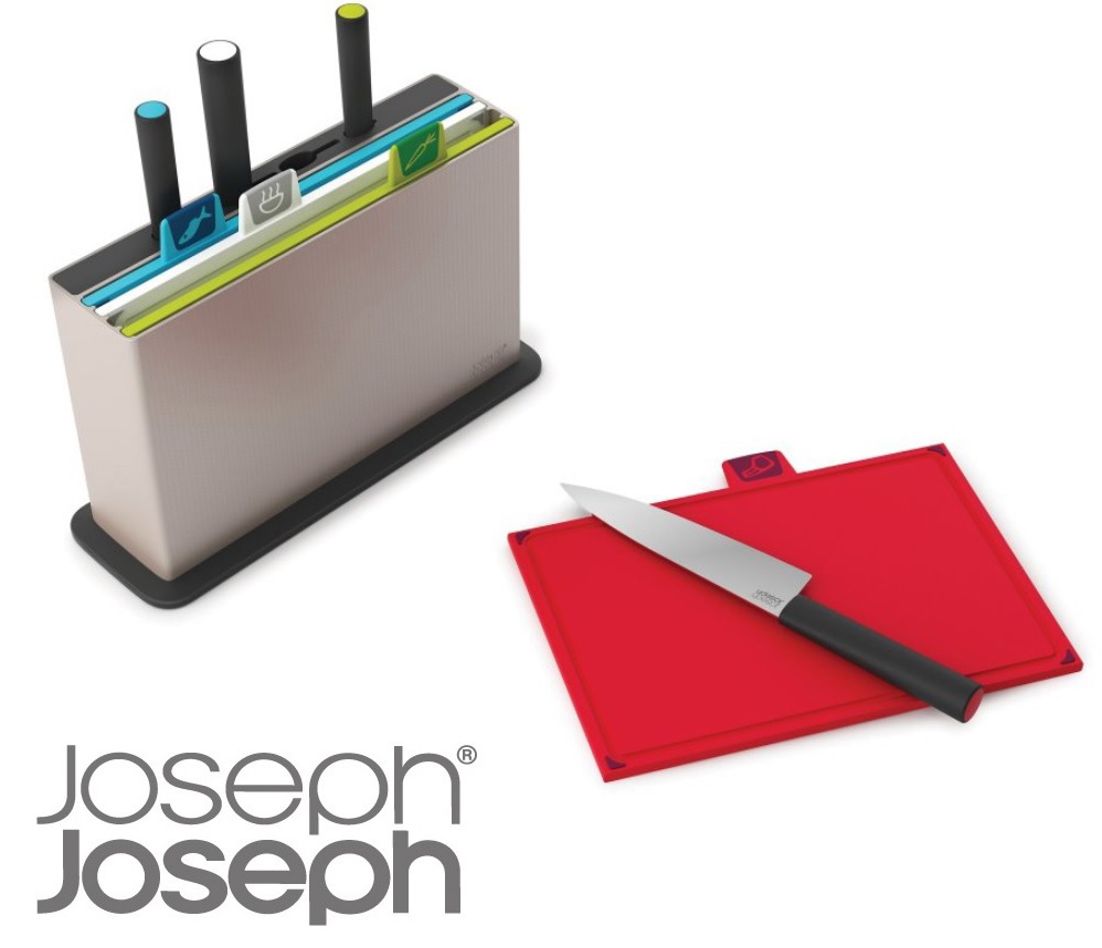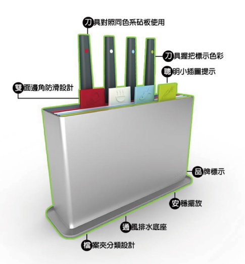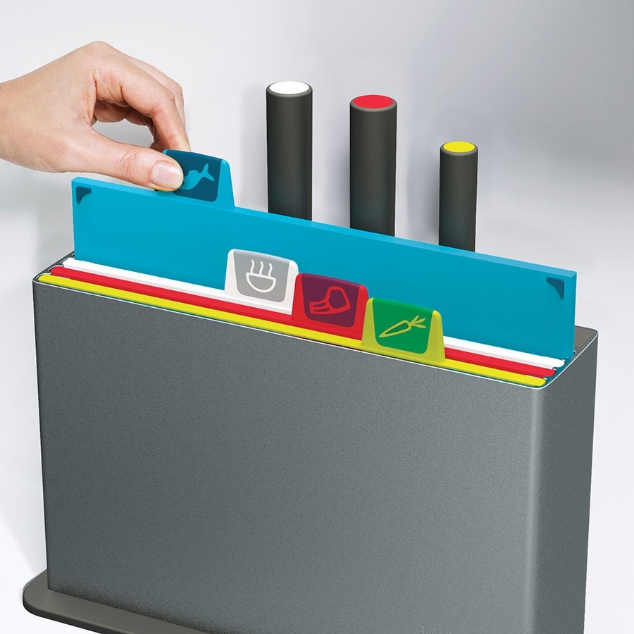 以檔案管理的創意概念,分類處理各式食材,避免交互咸染滋生細菌;砧板以不同色彩與圖案區分,讓您在切洗蔬 菜、海鮮、肉品或熟食時,都能有效利用,同時讓砧板保持衛生,料理更健康,Joseph Joseph 的貼心設計及多彩搭配,讓您開心使用、安心享受。