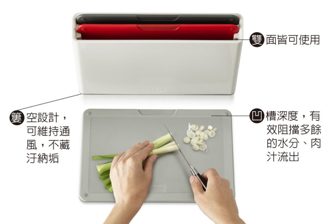 - 砧板有止滑設計,雙面皆可使用