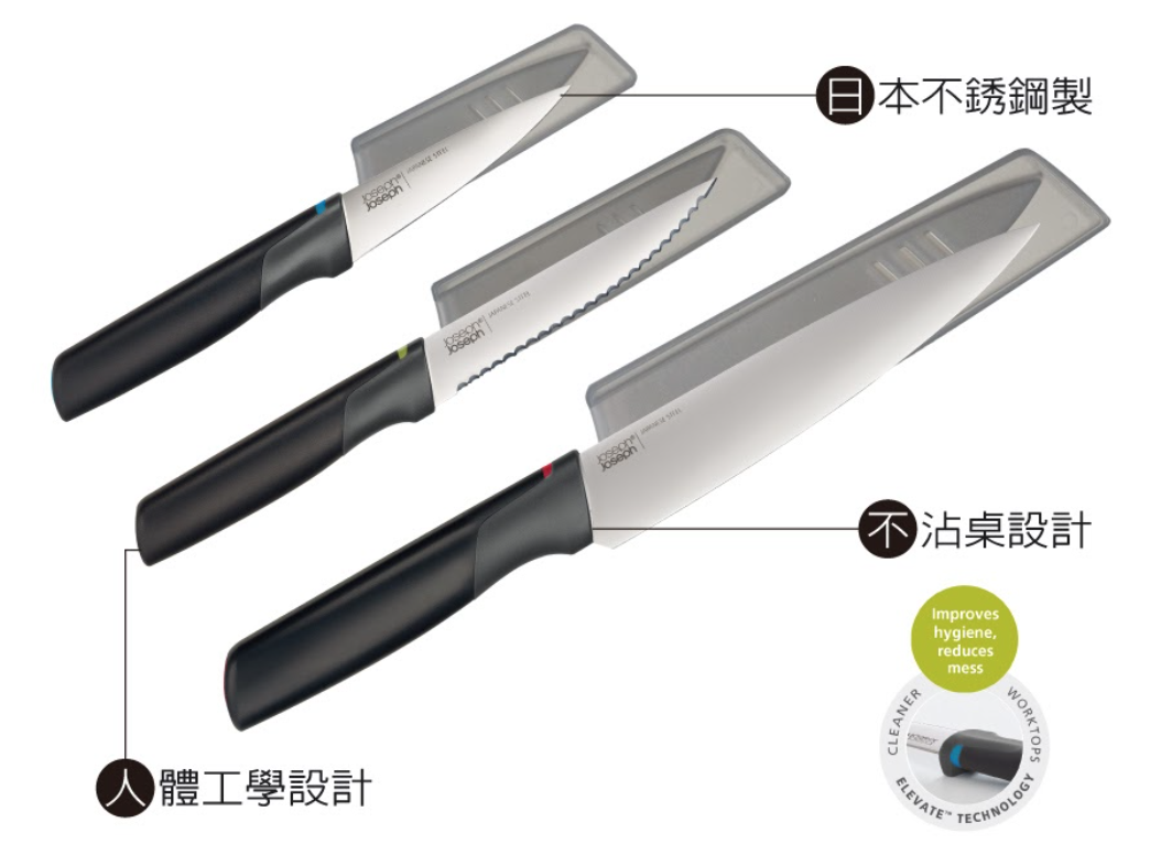 此不沾桌刀具系列,刀片由日本不鏽鋼製成,握柄部分可獨立支撐,讓刀面不會沾附在桌面,隨時保持桌面整潔。