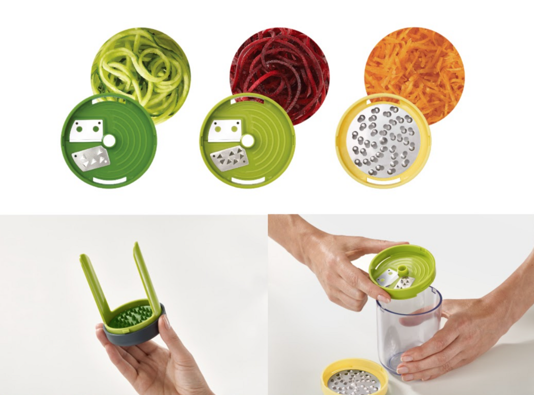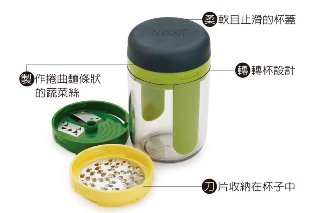 專為沙拉、起司設計的刨絲器,特殊的轉轉杯設計,將三種刀頭設計收納在杯中,可處理各種蔬菜水果,切絲製作成捲曲麵條狀的蔬菜絲;杯體可與刨絲時收納食材,保持食物不沾手與檯面清潔。