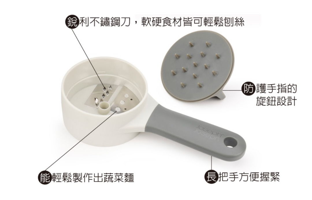 刀片採用不鏽鋼材質,將蔬果放入上蓋後旋轉即可變化多種料理,內有圓釘可固定蔬果方便刨絲;長把柄設計方便握緊施力,另有防護手指割傷的旋鈕設計。