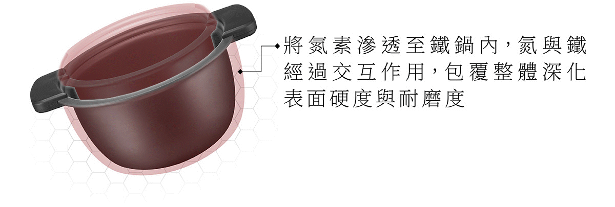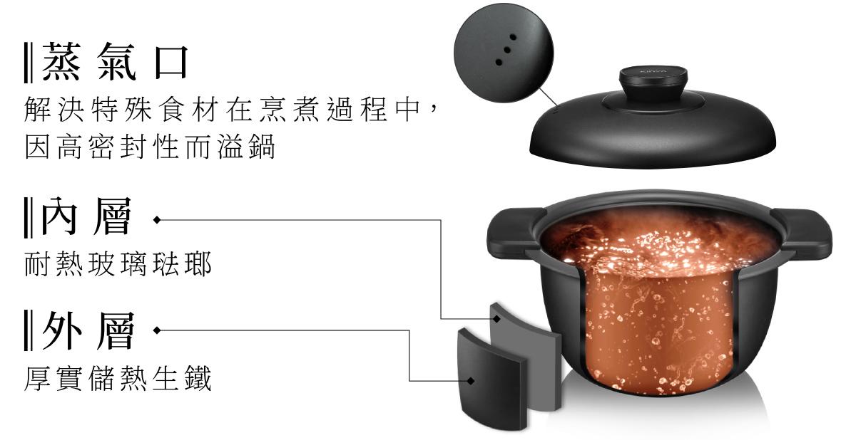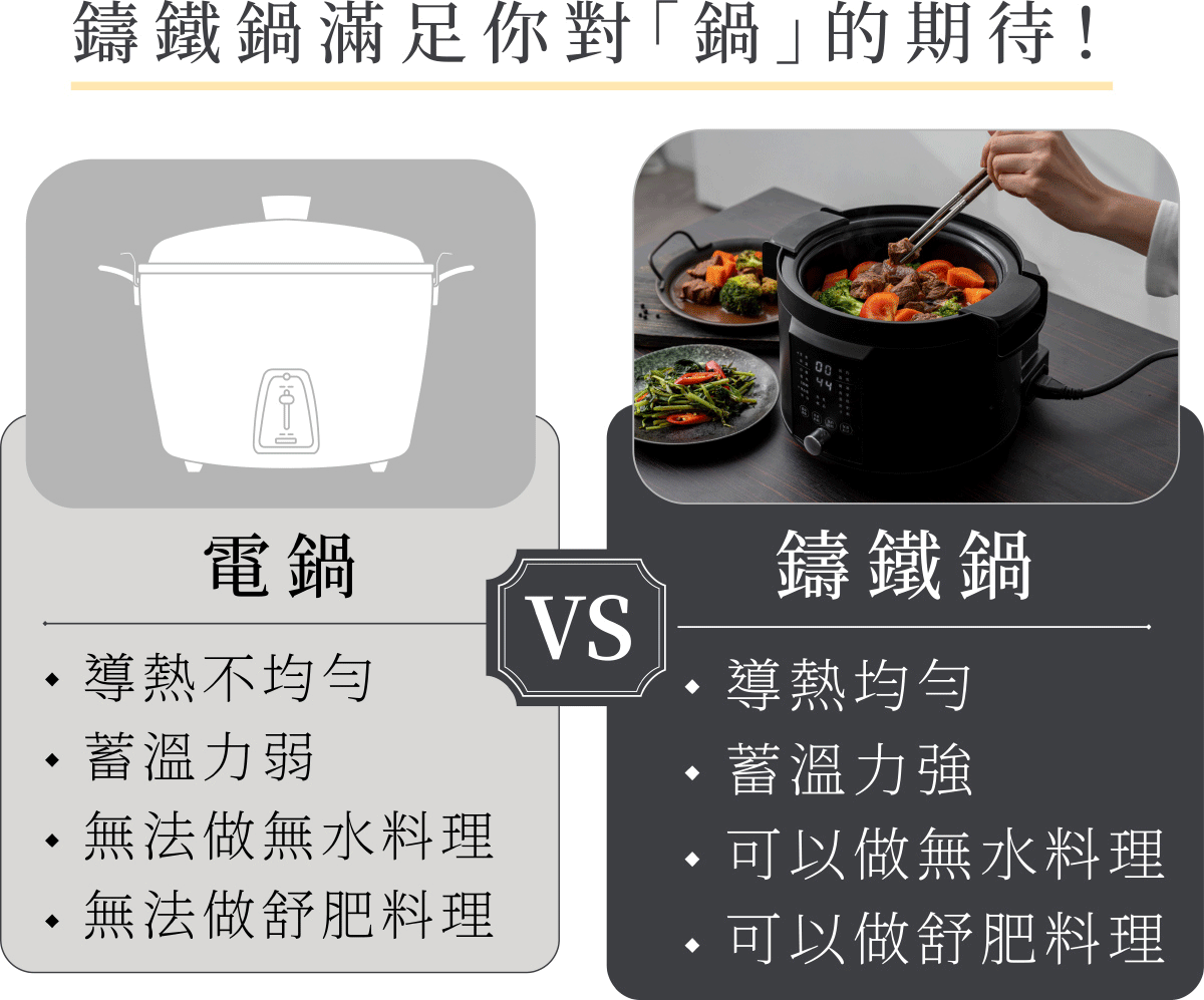 以鐵為鍋坯,鍋內再加入防鏽的琺瑯材質,結合兩者的特性讓鑄鐵鍋導熱快速,耐高溫、高儲熱,並解決鐵鍋易生鏽、沾黏問題,除此之外鍋蓋與鍋身高密合,可有效縮短烹調時間,讓食材的熟成更快速,輕鬆完成各種料理。