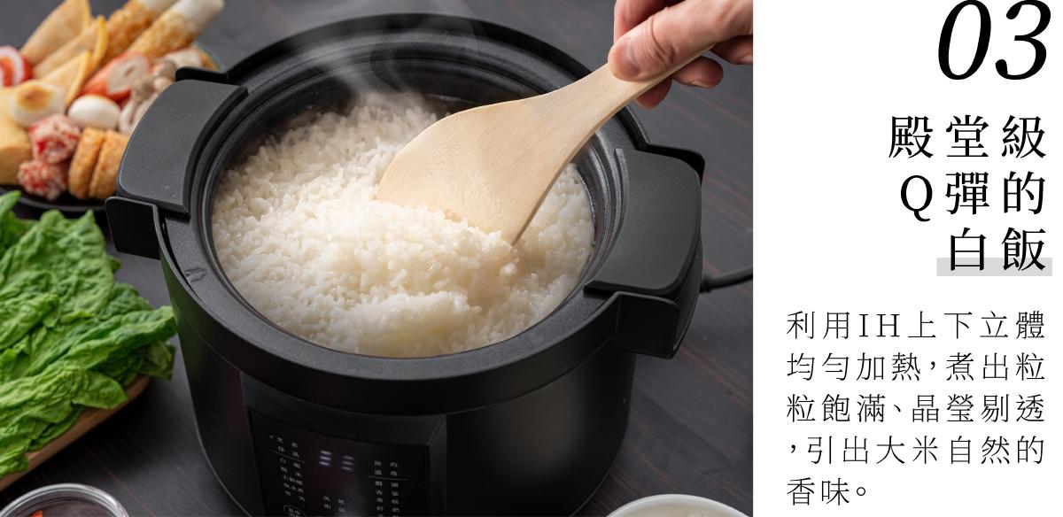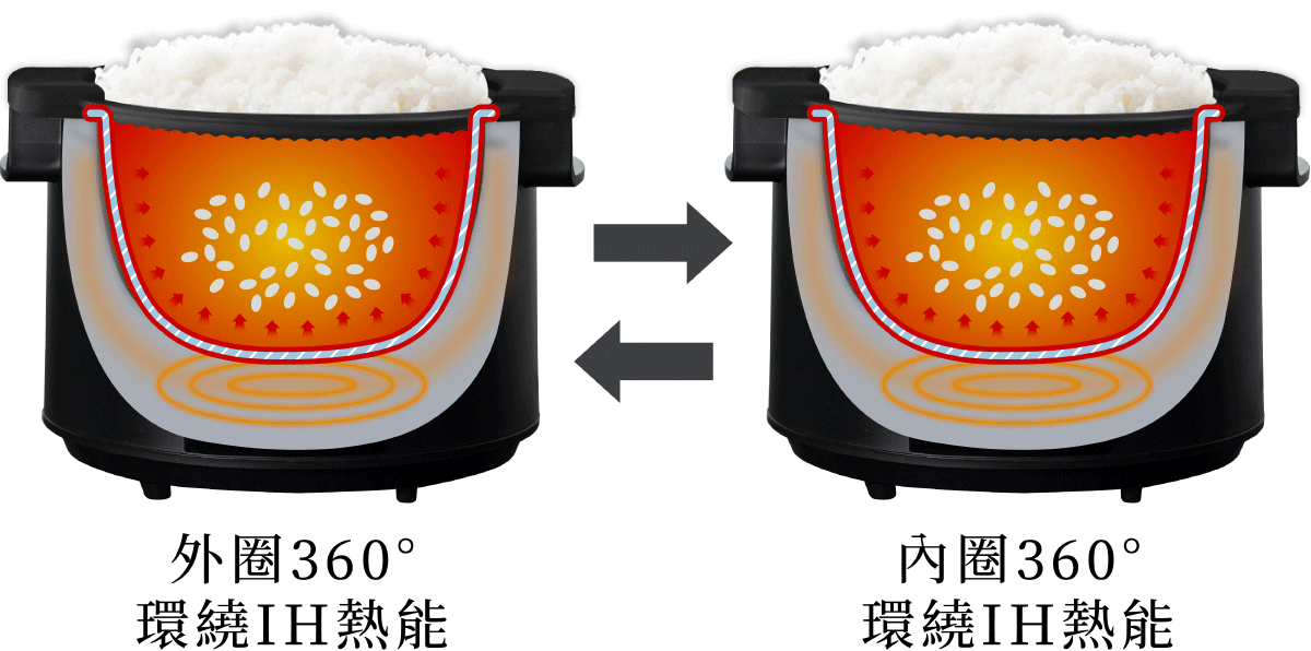 IH 加熱線圈環繞整個內鍋,由上到下全面均勻加熱,讓食材在鍋中 360° 立體翻滾,煮飯時可使每粒米徹底受熱,激發 Q 彈米香,美味程度大升級!