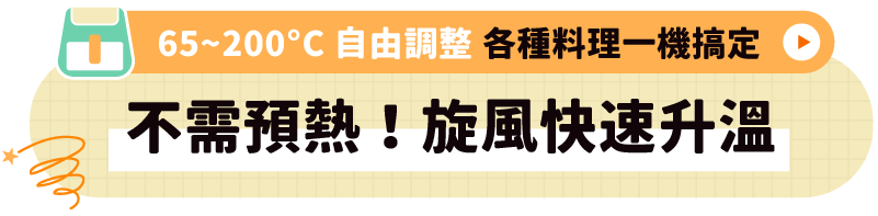 超廣 65~200°C 溫度範圍,不需預熱,利用旋風快速升溫,隨心所欲創造多樣菜色 !
